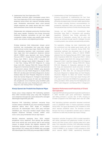 4. Implementasi Fast Tract Exploration (FTE)Memastikan komitmen dalam menerapkan proses bisnis Fast Track Exploration (FTE) untuk mempercepat tahapan eksplorasi secara efisien dan responsif terhadap peluang pasar. Memberikan rekomendasi teknis untuk peluang wilayah eksplorasi dan melalui akuisisi blok baru melalui skema kemitraan di area frontier dan emerging.Melaksanakan dan melakukan pemenuhan Komitmen Kerja Pasti sesuai regulasi. Pertamina Hulu Energi, khususnya Direktorat Eksplorasi memastikan visi dan misi dapat menjalankan melalui strategi yang spesifik pada existingassets, new ventures, serta kegiatan partnership.Strategi eksplorasi telah dilaksanakan dengan penuh komitmen dan membuahkan hasil yang baik, dengan adanya temuan sumber daya migas. Selama tahun 2024, PHE Subholding Upstream telah menemukan sumber daya migas baru hasil pengeboran eksplorasi sebesar 406,32 MMBOE yang diperoleh dari Sumur Padang Pancuran (PPC)-1, Sungai Rotan Downblock (SRD)-001, Pinang East (PNE)-1, Astrea (ATR)-1 Anggrek Violet (AVO)-001, Sidingin North (SDN)-1 (Regional 1); GQY1, East Pasir Catang (EPC)-001 (Regional 2); Julang Emas (JLE)-001, Tedong (TDG)-001, Piarawi (PIA)-001 (Regional 4). Sementara tambahan 2C dari hasil studi dan reassessment sebesar 245,87 MMBOE yang diperoleh dari struktur Uno dan Melati (Regional 1), struktur RDO, RDN, BLT, dan Banuwati-Asti-Ratna (Regional 2), struktur Sadewa Deep dan East Manpatu (Regional 3), struktur Wolai dan Sumber (Regional 4). Terdapat 2 (dua) temuan high impact dengan besaran 2C lebih dari 100 MMBOE dari pengeboran sumur eksplorasi yang dicatatkan pada tahun 2024 yaitu dari sumur Padang Pancuran (PPC)-1 di Regional 1, dan Tedong (TDG)-1 di Regional 4.Kinerja Operasi dan Produktivitas Eksplorasi MigasSecara umum, kinerja eksplorasi PHE Subholding Upstreamtahun 2024 mencatat kinerja yang cukup baik. Pengeboran sumur eksplorasi mencapai rasio sukses sebesar 67%, meningkat dibandingkan target 2024 yaitu 36%. Eksplorasi PHE Subholding Upstream menyerap biaya investasi sebesar USD308,79 juta untuk membiayai kegiatan eksplorasi selama tahun 2024. Angka ini mengalami penurunan 3% dibandingkan tahun 2023 yang mencapai USD318,22 juta. Penurunan tersebut terjadi karena fokus kegiatan Eksplorasi terhadap investasi selektif untuk sumur-sumur yang memberikan temuan high impact.Aktivitas eksplorasi sepanjang tahun 2024 meliputi pengeboran sumur eksplorasi, studi geologi dan geofisika, serta survei seismik dan survei lainnya, baik di area existingmaupun di wilayah terbuka. Dari kegiatan eksplorasi, PHE Subholding Upstream mencatat tambahan volume sumber daya kontinjen (2C) sebesar 652,19 MMBOE atau meningkat 34% dibandingkan tahun 2023 yang mencapai 488,15 MMBOE 4. Implementation of Fast Track Exploration (FTE)Ensuring commitment to implementing the Fast Track Exploration (FTE) business to accelerate exploration phases efficiently and responsively in line with market opportunities. This includes providing technical recommendations for prospective exploration areas and acquiring new blocks through partnership schemes in frontier and emerging areas.Carrying out and fulfilling Firm Commitment Work (Komitmen Kerja Pasti) in accordance with prevailing regulations. Pertamina Hulu Energi, particularly the Directorate of Exploration, ensures that its vision and mission are achieved through specific strategies focused on existing assets, new ventures, and partnership activities.The exploration strategy has been implemented with full commitment and has yielded good results, with the discovery of oil and gas resources. During 2024, PHE Subholding Upstream has discovered new oil and gas resources from exploration drilling of 406.32 MMBOE obtained from the Padang Pancuran (PPC)-1 Well, Sungai Rotan Downblock (SRD)-001, Pinang East (PNE)-1, Astrea (ATR)-1 Anggrek Violet (AVO)-001, Sidingin North (SDN)-1 (Regional 1); GQY-1, East Pasir Catang (EPC)-001 (Regional 2); Julang Emas (JLE)-001, Tedong (TDG)-001, Piarawi (PIA)-001 (Regional 4). Meanwhile, additional 2C from the study and reassessment results amounted to 245.87 MMBOE obtained from the Uno and Melati structures (Regional 1), RDO, RDN, BLT, and Banuwati-Asti-Ratna Structures (Regional 2), Sadewa Deep and East Manpatu Structures (Regional 3), Wolai and Sumber Structures (Regional 4). There were 2 (two) high impact findings with a 2C value of more than 100 MMBOE from exploration well drilling recorded in 2024, namely from the Padang Pancuran (PPC)-1 well in Regional 1, and Tedong (TDG)-1 in Regional 4.Operation Performance and Productivity of Oil and Gas ExplorationIn general, PHE Subholding Upstream's exploration performance in 2024 recorded quite good performance. Exploration well drilling achieved a success ratio of 67%, showing an increase compared to the 2024 target, which was set a 36%. PHE Subholding Upstream exploration absorbed investment costs of USD308.79 million to finance exploration activities during 2024. This figure decreased by 3% compared to 2023 which reached USD318.22 million. The decrease occurred because the focus of exploration activities was on selective investment for wells that provided high impact findings.Exploration activities throughout 2024 included exploration well drilling, geological and geophysical studies, as well as seismic and other surveys, both in existing areas and in open areas. From exploration activities, PHE Subholding Upstream recorded an additional volume of contingent resources (2C) of 652.19 MMBOE or an increase of 34% compared to 2023 which reached 488.15 MMBO, representing Pertamina%u2019s 010203 04 Management Discussion & Analysis Pembahasan & Analisis Manajemen050607 PT Pertamina Hulu Energi 173