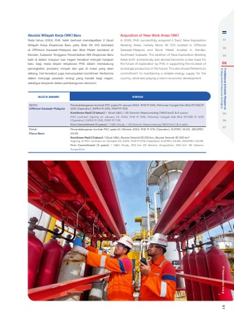 Akuisisi Wilayah Kerja (WK) BaruPada tahun 2024, PHE telah berhasil mendapatkan 2 (dua) Wilayah Kerja Eksplorasi Baru yaitu Blok SK 510 berlokasi di Offshore Sarawak-Malaysia dan Blok Melati berlokasi di Kendari, Sulawesi Tenggara. Penambahan WK Eksplorasi Baru baik di dalam maupun luar negeri tersebut menjadi harapan baru bagi masa depan eksplorasi PHE dalam mendukung peningkatan produksi minyak dan gas di masa yang akan datang. Hal tersebut juga menunjukkan komitmen Pertamina dalam menjaga pasokan energi yang handal bagi negeri, sekaligus berperan dalam pembangunan ekonomi. Acquisition of New Work Areas (WK)In 2024, PHE successfully acquired 2 (two) New Exploration Working Areas, namely Block SK 510 located in Offshore Sarawak-Malaysia and Block Melati located in Kendari, Southeast Sulawesi. The addition of New Exploration Working Areas both domestically and abroad becomes a new hope for the future of exploration by PHE in supporting the increase of oil and gas production in the future. This also shows Pertamina's commitment to maintaining a reliable energy supply for the country, while also playing a role in economic development.BLOCK AWARD STATUSSK510Offshore Sarawak-MalaysiaPenandatanganan kontrak PSC pada 23 Januari 2024. PHE PI 25%, Petronas Carigali Sdn Bhd (PCSB) PI 40% (Operator), INPEX PI 25%, PSEP PI 10%Komitmen Pasti (3 tahun): 1 Studi G&G ,1 3D Seismic Reprocessing (1800 km2) & 4 sumurPSC contract signing on January 23, 2024. PHE PI 25%, Petronas Carigali Sdn Bhd (PCSB) PI 40% (Operator), INPEX PI 25%, PSEP PI 10%Firm Commitment (3 years): 1 G&G Study ,1 3D Seismic Reprocessing (1800 km2) & 4 wellsMelatiManui BasinPenandatanganan kontrak PSC pada 24 Oktober 2024. PHE PI 51% (Operator), KUFPEC 24.5%, SINOPEC 24.5%Komitmen Pasti (3 tahun): 1 Studi G&G, Akuisisi Seismik 2D 250 km, Akuisisi Seismik 3D 200 km2.Signing of PSC contract on October 24, 2024. PHE PI 51% (Operator), KUFPEC 24.5%, SINOPEC 24.5%.Firm Commitment (3 years): 1 G&G Study, 250 km 2D Seismic Acquisition, 200 km2 3D Seismic Acquisition010203 04 Management Discussion & Analysis Pembahasan & Analisis Manajemen050607 PT Pertamina Hulu Energi 177