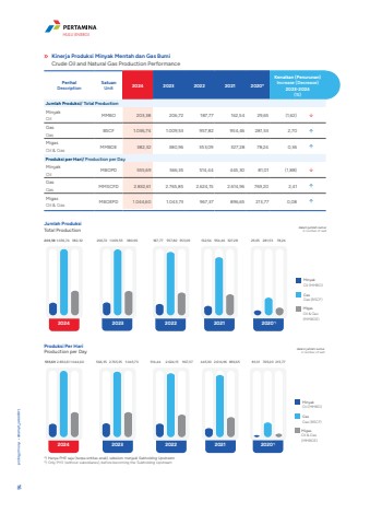 PerihalDescriptionSatuanUnit 2024 2023 2022 2021 2020*Kenaikan (Penurunan)Increase (Decrease)2023-2024(%)Jumlah Produksi/ Total ProductionMinyakOilMMBO 203,38 206,72 187,77 162,54 29,65 (1,62) %uf0e2GasGasBSCF 1.036,74 1.009,53 957,82 954,46 281,53 2,70 %uf0e1MigasOil & GasMMBOE 382,32 380,96 353,09 327,28 78,24 0,36 %uf0e1Produksi per Hari/ Production per DayMinyakOilMBOPD 555,69 566,35 514,44 445,30 81,01 (1,88) %uf0e2GasGasMMSCFD 2.832,61 2.765,85 2.624,15 2.614,96 769,20 2,41 %uf0e1MigasOil & GasMBOEPD 1.044,60 1.043,73 967,37 896,65 213,77 0,08 %uf0e1Jumlah ProduksiTotal Production dalam jumlah sumur in number of well203,38 1.036,74 382,32 206,72 1.009,53 380,96 187,77 957,82 353,09 162,54 954,46 327,28 29,65 281,53 78,24Minyak Oil (MMBO)GasGas (BSCF)MIgasOil & Gas(MMBOE)2024 2023 2022 2021 2020*)Produksi Per HariProduction per Day dalam jumlah sumur in number of well555,69 2.832,61 1.044,60 566,35 2.765,35 1.043,73 514,44 2.624,15 967,37 445,30 2.614,96 896,65 81,01 769,20 213,77Minyak Oil (MMBO)GasGas (BSCF)MIgasOil & Gas(MMBOE)2024 2023 2022 2021 2020*)Kinerja Produksi Minyak Mentah dan Gas BumiCrude Oil and Natural Gas Production Performance*) Hanya PHE saja (tanpa entitas anak), sebelum menjadi Subholding Upstream*) Only PHE (without subsidiaries), before becoming the Subholding UpstreamLaporan Tahunan %u2022 Annual Report 16PT Pertamina Hulu Energi 17HULU ENERGI