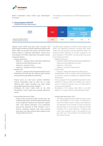 PerihalSubject 2024 2023Kenaikan (Penurunan)Increase (Decrease)NominalAmountPersentasePercentage(%)Kegiatan EOR/IOR (BOPD)EOR/IOR (BOPD) Activities 7.159 3.537 3.622 102 %uf0e1Kinerja Kegiatan EOR/IOREOR/IOR Activity PerformanceRealisasi kinerja S/EOR pada tahun 2024 mencapai 7.159 BOPD dengan tercapainya produksi Waterflood sebesar 6.991 BOPD (128%) dan produksi EOR sebesar 168 BOPD (142%), angka produksi ini bertambah dibandingkan realisasi tahun lalu sebanyak 3.537 BOPD. Keberhasilan pencapaian tersebut berasal dari aktivitas:%u2022 Kegiatan Waterflood- Regional 1 : Lapangan Rantau, WK Rokan (Waterflood Expansion & New Waterflood) dan Jirak- Regional 2 : Lapangan E-Main- Regional 3 : Lapangan Handil dan Tanjung%u2022 Kegiatan EOR- Regional 1 : Lapangan Rokan (Steamflood NDD Area 14)%u2022 Pelaksanaan RK sesuai plan dan optimasi injeksi produksi pada waterflood pada Waterflood WK Rokan %u2022 Program gross up sumur-sumur produksi Waterflood Tanjung, Pemanfaatan make up water dari air sungai Tabalong dalam rangka menaikkan rate injeksi sampai dengan 68K bwipd sesuai dengan FID/POD.%u2022 Percepatan RK Sumur Injeksi 2025 ke Q4 2024 (Penambahan 1 Sumur Injeksi untuk Lapangan Waterflood Handil).%u2022 Drilling & Well Intervention (DWI)- Drilling & Well Intervention (DWI) memiliki peran dan tanggung jawab dalam usaha pencapaian target jumlah sumur pengeboran eksplorasi dan eksploitasi, kegiatan KUPL, serta aktivitas perawatan sumur berdasarkan pada prinsip Operation & HSSE Excellence. Hal ini penting, mengingat sebagian besar biaya investasi pada sektor hulu migas berada di dalam kegiatan fungsi Drilling & Well Intervention.The performance realization of S/EOR in 2024 reached 7,159 BOPD, with Waterflood production achieving 6,991 BOPD (128%) and EOR production reaching 168 BOPD (142%). This production figure represents an increase compared to last year%u2019s realization of 3,537 BOPD. This achievement was driven by the following activities:%u2022 Waterflood Activities- Regional 1 : Rantau Field, Rokan Working Area (Waterflood Expansion & New Waterflood) and Jirak- Regional 2 : E-Main Field- Regional 3 : Handil and Tanjung Fields%u2022 EOR Activities- Regional 1 : Rokan Field (Steamflood NDD Area 14)%u2022 Implementation of RK according to plan and optimization of production injection at waterflood at Waterflood Rokan Working Area%u2022 Gross up program for Tanjung Waterflood production wells, Utilization of make up water from Tabalong river water in order to increase the injection rate up to 68K bwipd in accordance with FID/POD.%u2022 Acceleration of RK Injection Well 2025 to Q4 2024 (Addition of 1 Injection Well for Handil Waterflood Field).%u2022 Drilling & Well Intervention (DWI)- The Drilling & Well Intervention (DWI) function has roles and responsibilities in the context of endeavours to achieve the target number of drilling wells, exploration and exploitation, KUPL activities, and well maintenance activities based on the principles of Operation & HSSE Excellence. This is rather significant, considering that most of the investment costs in the upstream oil and gas sector are in the activities of the Drilling & Well Intervention function. Berikut disampaikan kinerja S/EOR yang dikembangkan Perusahaan.The following is the performance of S/EOR developed by the Company.Laporan Tahunan %u2022 Annual Report 182HULU ENERGI