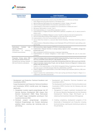 Kegiatan UtamaMain ActivitiesUraian PencapaianDescription of AchievementsSome programs that have been carried out by the DWI function in 2024 are as follows:1. Multi-Stage Fracturing with 8 sections in the Rokan Zone.2. Well Architecture Optimization for cost reduction in zones 1, Rokan, 4, 8, and 9.3. Velocity String implementation for production optimization in Zone 1.4. Implementation of Monobore Completion for Cost reduction in Rokan and zone 1.5. Rig Layout Optimization in zones 1 and 46. First Implementation of i-Cruise RSS in Indonesia in zone 5.7. Implementation of Rigless Activities (P&A before sidetrack, completion, etc.) in various zones to reduce costs.8. Implementation of Wellbore Reamer in zones 7 and 8, to reduce costs due to tripping time.9. Record Casing While Drilling (CWD) deepest in Indonesia carried out by zone 9.10. Implementation of the first Horizontal Well in BUNYU Zone 10.11. Use of Ultra-Fine Cement to overcome Bad Cement Bonding / Remedial Cementing cases in zone 4.12. Implementation of Borderless Drilling in zone 9 between PEP and PHSS which saves drilling costs significantly.Optimalisasi Kontrak dan kegiatan OPTIMUSOptimization of OPTIMUS Contracts and Activities1. DWI berkontribusi dalam kegiatan OPTIMUS di Subholding Upstream.2. Implementasi Integrasi Kontrak di masing-masing regional untuk memudahkan penggunaan kontrak lintas zona.1. DWI contributes to OPTIMUS activities in Upstream Subholding.2. Implementation of Contract Integration in each region to facilitate the use of cross-zone contracts.Penguatan Sinergi antara DWI dan anak perusahaan PertaminaStrengthening Synergy between DWI and Pertamina subsidiaries1. Support terhadap implementasi proyek IDESS (Integrated Drilling, Engineering, Supervisory, and Services) di ROKAN antara DWI SHU, DWI ROKAN, dan PDSI.2. Support terhadap implementasi Proyek HWU Drilling antara DWI SHU, DWI zona 8, dan ELNUSA.3. Support terhadap implementasi Proyek Jack Up Rig dan Services di Regional 2, bekerja sama dengan PDSI dan ELNUSA.1. Support on the implementation of the IDESS (Integrated Drilling, Engineering, Supervisory, and Services) project in ROKAN between DWI SHU, DWI ROKAN, and PDSI.2. Support regarding the implementation of the HWU Drilling Project between DWI SHU, DWI zone 8, and ELNUSA.3. Support towards the implementation of the Jack Up Rig and Services Project in Region 2, in collaboration with PDSI and ELNUSA.%u2022 Development and Production Technical Excellence and Coordination (DTEC)Fungsi Development and Production Technical Excellence and Coordination (DTEC) memiliki peran dan tanggung jawab yaitu:1. Pengelolaan investasi organik pengembangan dan AP Services Business Development (BD) maupun Non Business Development (NBD) Tahap Perencanaan (Pra Proyek) hingga mendapatkan persetujuan Final Investment Decision (FID).2. Membuat program pengembangan kompetensi Direktorat Pengembangan dan Produksi diantaranya pelatihan teknis, coaching dan mentoring serta on job training.%u2022 Development and Production Technical Excellence and Coordination (DTEC)The Development and Production Technical Excellence and Coordination (DTEC) function has the following roles and responsibilities:1. Management of organic investment development and AP Services (Business Development and Non Business Development) Planning Stage (Pre-Project) up to obtaining Final Investment Decision (FID) approval.2. Creating competency development programs of the Directorate of Development and Production including technical training, coaching and mentoring as well as on the job training.Laporan Tahunan %u2022 Annual Report 184HULU ENERGI