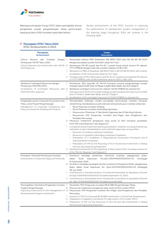 PencapaianAchievementUraianDescriptionUnlock Reserve dan Investasi dengan Persetujuan FID RK Tahun 2024Unlock Reserves and Investments with FID RK 2024 Approval1. Penyerapan sebesar 99% Drawdown ABI RKAP 2024 atau 82 FID BD RK 2024 dengan percepatan proses SLA lebih cepat 15,17 hari.2. Persetujuan FID 82 proyek dan Pre-ID 1 proyek meng-unlock reserve 2P sebesar 777,5 MMBOE dengan total nilai investasi sebesar 4.3 Bio USD.1. Absorption of 99% of Drawdown ABI RKAP 2024 or 82 FID BD RK 2024, with a faster acceleration of the SLA process faster by 15.17 days.2. The Approvals of FID of 82 projects and Pre-ID of 1 projects unlocked the 2P reserves of 777.5 MMBOE, with a total investment value of USD 4,.3 Bio USD.Akselerasi Contingent Resources dengan Persetujuan POD/OPL/OPLLAcceleration of Contingent Resources with POD/OPL/OPLL Approval1. Persetujuan DG2 sejumlah 20 Pre-FS termasuk rencana pengembangan proyek strategis seperti NDD Area 14 Phase 2, Badik West Badik, dan SLO Stage 6.2. Akselerasi contingent resources 2C sebesar 143,94 MMBOE ke subclass K2.1. DG2 approval of 20 Pre-FS include strategic project development plans such as NDD Area 14 Phase 2, Badik West Badik, and SLO Stage 6.2. Acceleration of 2C contingent resources of 143.94 MMBOE to subclass K2.Pengelolaan proses Corporate Governance dan Policy untuk Proyek PengembanganManagement of Corporate Governance and Policy processes for Development Projects1. Menyelesaikan beberapa inisiatif percepatan perencanaan investasi termasuk streamlining, standardisasi proyek maturasi serta persetujuan investasi antara lain:%u2022 Revisi Pedoman Investasi Holding,%u2022 Revisi Pedoman Investasi Subholding Upstream,%u2022 Penyusunan 2 Pedoman, 9 Tata Kelola Organisasi dan 8 Tata Kerja Individu,%u2022 Penyusunan STK Pengusulan Investasi Non-Migas Jasa Pengeboran dan Peralatan Penunjang.2. Menyusun mekanisme pengaturan early works di SHU termasuk penerbitan 6 Pre-FID untuk Regional 1 dan Regional 2.1. Completed several investment planning acceleration initiatives, including streamlining, maturation project standardization and investment approvals, among others:%u2022 Revisions of Holding Investment Guidelines,%u2022 Revisions of Upstream Subholding Investment Guidelines,%u2022 Preparation of 2 Guidelines, 9 Organizational Governance Procedures and 8 Individual Work Procedures,%u2022 Preparation of STK for the Proposing of Non-Oil and Gas Investments in Drilling Services and Supporting Equipment.2. Developed mechanism for the regulating of early works in SHU, including issuance of 6 Pre-FIDs for Regional 1 and Regional 2.Perubahan Threshold Persetujuan InvestasiAmendments to Investment Approval Thresholds1. Kontribusi terhadap penentuan threshold investasi sebagaimana diatur dalam Surat Keputusan No.Kpts-020/PHE00000/2024-S0 tertanggal 10 September 2024.2. Kontribusi terhadap penetapan Komite Investasi & Manajemen Risiko sebagaimana diatur dalam Surat Keputusan No. Kpts-012/PHE00000/2024-S0 tertanggal 28 Juni 2024.1. Contributions in the determination of investment thresholds, as stipulated in Decree No.Kpts-020/PHE00000/2024-S0 dated September 10, 2024.2. Contributions in the establishment of Investment Committee, as stipulated in Decree No. Kpts-012/PHE00000/2024-S0 dated June 28, 2024.Meningkatkan Tata Kelola Pengelolaan Investasi Organik PengembanganImproving Governance for the Management of Developmental Organic Investments1. Penerbitan TKO Pengusulan Investasi BD & NBD Pengembangan Migas.2. Penyusunan mekanisme pengaturan early works di SHU (under DTEC).3. Penyusunan STK Pengusulan Investasi Non-Migas Jasa Pengeboran dan Peralatan Penunjang.1. Issuance of TKO for Proposed BD & NBD Investments in Oil and Gas Development.2. Preparation of regulatory mechanism for early works in SHU (under DTEC).3. Preparation of STK for the Proposing of Non-Oil and Gas Investments in Drilling Services and Supporting Equipment.Pencapaian DTEC Tahun 2024DTEC Achievements in 2024Beberapa pencapaian Fungsi DTEC dalam peningkatan kinerja pengelolaan proyek pengembangan tahap perencanaan sepanjang tahun 2024 diuraikan pada tabel berikut.Several achievements of the DTEC Function in improving the performance of development project management in the planning stage throughout 2024 are outlined in the following table.Laporan Tahunan %u2022 Annual Report 186HULU ENERGI