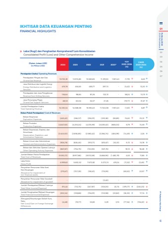 (Dalam Jutaan USD)(In Million USD) 2024 2023 2022 2021 2020**)YOY2020-2024(%)CAGR2020-2024(%)Pendapatan Usaha/ Operating RevenuesPendapatan Minyak dan GasOil and Gas Revenue 13.725,39 13.974,85 15.583,85 11.319,55 1.901,43 (1,79) %uf0e2 6,63 %uf0e1Jasa Distribusi dan logistik EnergiEnergy Distribution and Logistics Services419,78 434,65 483,71 297,15 - (3,42) %uf0e2 12,20 %uf0e1Pendapatan dari Jasa PengeboranRevenue from Drilling Services 136,64 98,84 81,26 102,13 - 38,24 %uf0e1 10,19 %uf0e1Jasa Penunjang MigasOil and Gas Support Services 48,53 60,04 34,57 21,26 - (19,17) %uf0e2 31,67 %uf0e1Jumlah Pendapatan UsahaTotal Operating Revenue 14.330,34 14.568,38 16.183,40 11.740,08 1.901,43 (1,63) %uf0e2 6,87 %uf0e1Beban Pokok Pendapatan/ Cost of RevenuesBeban EksplorasiExploration Expenses (465,42) (266,57) (256,91) (235,38) (83,89) 74,60 %uf0e2 25,51 %uf0e1Beban ProduksiProduction Expenses (4.647,65) (4.233,24) (4.015,99) (3.009,40) (883,00) 9,79 %uf0e2 15,59 %uf0e1Beban Depresiasi, Deplesi, dan AmortisasiDepreciation, Depletion, and Amortization Expenses(2.443,00) (2.856,85) (2.580,42) (2.284,74) (484,99) (14,49) %uf0e1 2,26 %uf0e1Beban Umum dan AdministrasiGeneral and Administration Expenses (906,78) (826,45) (913,71) (615,67) (30,31) 9,72 %uf0e2 13,78 %uf0e1Beban dari Aktivitas Operasi LainnyaOther Operating Activity Expenses (867,87) (734,75) (743,55) (521,76) - 18,12 %uf0e2 18,48 %uf0e1Jumlah Beban Pokok PendapatanTotal Cost of Revenues (9.330,72) (8.917,86) (8.510,58) (6.666,96) (1.482,19) 4,63 %uf0e2 11,86 %uf0e1Laba KotorGross Profit 4.999,62 5.650,52 7.672,82 5.073,13 419,24 (11,52) %uf0e2 (0,49) %uf0e1Penyisihan Penurunan Nilai Aset Non KeuanganAllowance for impairment of non-financial assets(215,67) (707,09) (165,61) (115,99) - (69,50) %uf0e1 22,97 %uf0e1Penyisihan Penurunan Nilai GoodwillAllowance for impairment of goodwill - - - (0,42) - - - -Jumlah Pendapatan/(Beban) LainnyaTotal Other Income/(Expense) 315,44 (112,75) (247,87) (103,05) 22,74 (379,77) %uf0e1 (245,20) %uf0e2Jumlah Penghasilan/(Beban) KeuanganTotal Financial Income/(Expense) (202,34) (318,88) (194,91) (123,98) (22,82) (36,55) %uf0e1 17,74 %uf0e1(Kerugian)/Keuntungan Selisih Kurs, NetoNet (Loss)/Gain on Foreign Exchange Differences(4,48) (19,77) 53,83 5,29 3,10 (77,34) %uf0e1 (194,61) %uf0e2Laba (Rugi) dan Penghasilan Komprehensif Lain KonsolidasianConsolidated Profit (Loss) and Other Comprehensive Income IKHTISAR DATA KEUANGAN PENTINGFINANCIAL HIGHLIGHTS01 2024 Performance Performa 2024020304050607Laporan Tahunan %u2022 Annual Report 16PT Pertamina Hulu Energi 17