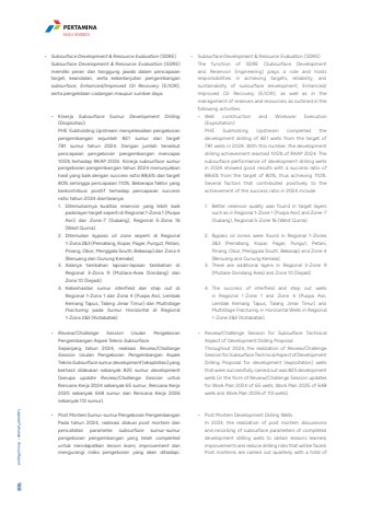 %u2022 Subsurface Development & Resource Evaluation (SDRE)Subsurface Development & Resource Evaluation (SDRE) memiliki peran dan tanggung jawab dalam pencapaian target, keandalan, serta keberlanjutan pengembangan subsurface, Enhanced/Improved Oil Recovery (E/IOR), serta pengelolaan cadangan maupun sumber daya.%u2022 Kinerja Subsurface Sumur Development Drilling(Eksploitasi)PHE Subholding Upstream menyelesaikan pengeboran pengembangan sejumlah 821 sumur dari target 781 sumur tahun 2024. Dengan jumlah tersebut pencapaian pengeboran pengembangan mencapai 105% terhadap RKAP 2024. Kinerja subsurface sumur pengeboran pengembangan tahun 2024 menunjukkan hasil yang baik dengan success ratio 88,6% dari target 80% sehingga pencapaian 110%. Beberapa faktor yang berkontribusi positif terhadap pencapaian success ratio tahun 2024 diantaranya:1. Ditemukannya kualitas reservoir yang lebih baik pada layer target seperti di Regional 1-Zona 1 (Puspa Asri) dan Zona-7 (Subang), Regional 5-Zona 16 (West Qurna).2. Ditemukan bypass oil zone seperti di Regional 1-Zona 2&3 (Pematang, Kopar, Pager, Pungut, Petani, Pinang, Obor, Menggala South, Bekasap) dan Zona 4 (Benuang dan Gunung Kemala).3. Adanya tambahan lapisan-lapisan tambahan di Regional 3-Zona 9 (Mutiara-Area Dondang) dan Zona 10 (Sejadi).4. Keberhasilan sumur interfield dan step out di Regional 1-Zona 1 dan Zona 4 (Puspa Asri, Lembak Kemang Tapus, Talang Jimar Timur) dan Multistage Fracturing pada Sumur Horizontal di Regional 1-Zona 2&3 (Kotabatak). %u2022 Review/Challange Session Usulan Pengeboran Pengembangan Aspek Teknis SubsurfaceSepanjang tahun 2024, realisasi Review/Challange Session Usulan Pengeboran Pengembangan Aspek Teknis Subsurface sumur development (eksploitasi) yang berhasil dilakukan sebanyak 825 sumur development(berupa update Review/Challenge Session untuk Rencana Kerja 2024 sebanyak 65 sumur, Rencana Kerja 2025 sebanyak 648 sumur dan Rencana Kerja 2026 sebanyak 112 sumur).%u2022 Post Mortem Sumur-sumur Pengeboran PengembanganPada tahun 2024, realisasi diskusi post mortem dan pencatatan parameter subsurface sumur-sumur pengeboran pengembangan yang telah completeduntuk mendapatkan lesson learn, improvement dan mengurangi risiko pengeboran yang akan dihadapi. %u2022 Subsurface Development & Resource Evaluation (SDRE)The function of SDRE (Subsurface Development and Reservoir Engineering) plays a role and holds responsibilities in achieving targets, reliability, and sustainability of subsurface development, Enhanced/Improved Oil Recovery (E/IOR), as well as in the management of reserves and resources, as outlined in the following activities.%u2022 Well construction and Workover Execution (Exploitation)PHE Subholding Upstream completed the development drilling of 821 wells from the target of 781 wells in 2024. With this number, the development drilling achievement reached 105% of RKAP 2024. The subsurface performance of development drilling wells in 2024 showed good results with a success ratio of 88.6% from the target of 80%, thus achieving 110%. Several factors that contributed positively to the achievement of the success ratio in 2024 include:1. Better reservoir quality was found in target layers such as in Regional 1-Zone 1 (Puspa Asri) and Zone-7 (Subang), Regional 5-Zone 16 (West Qurna).2. Bypass oil zones were found in Regional 1-Zones 2&3 (Pematang, Kopar, Pager, Pungut, Petani, Pinang, Obor, Menggala South, Bekasap) and Zone 4 (Benuang and Gunung Kemala).3. There are additional layers in Regional 3-Zone 9 (Mutiara-Dondang Area) and Zone 10 (Sejadi)4. The success of interfield and step out wells in Regional 1-Zone 1 and Zone 4 (Puspa Asri, Lembak Kemang Tapus, Talang Jimar Timur) and Multistage Fracturing in Horizontal Wells in Regional 1-Zone 2&3 (Kotabatak). %u2022 Review/Challenge Session for Subsurface Technical Aspect of Development Drilling Proposal Throughout 2024, the realization of Review/Challenge Session for Subsurface Technical Aspect of Development Drilling Proposal for development (exploitation) wells that were successfully carried out was 825 development wells (in the form of Review/Challenge Session updates for Work Plan 2024 of 65 wells, Work Plan 2025 of 648 wells and Work Plan 2026 of 112 wells).%u2022 Post Mortem Development Drilling WellsIn 2024, the realization of post mortem discussions and recording of subsurface parameters of completed development drilling wells to obtain lessons learned, improvements and reduce drilling risks that will be faced. Post mortems are carried out quarterly with a total of Laporan Tahunan %u2022 Annual Report 188HULU ENERGI