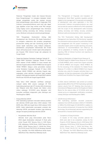 Pedoman %u201cPengelolaan Usulan dan Evaluasi Rencana Kerja Pengembangan%u201d ini mengatur kebijakan terkait dengan pengelolaan usulan dan evaluasi rencana kerja pengembangan yang berlaku di lingkungan PHE (internal consumption/internal used only) dan dapat juga dijadikan acuan bagi entitas anak PHE dengan ruang lingkup sumur pengembangan baru (termasuk aktivitas existing secondary dan tertiary recovery), sumur Workover serta akuisisi seismik pengembangan. TKO %u201cPengelolaan Postmortem Drilling Well Development dan Monitoring FID Aspek Subsurface%u201d ini mengatur mekanisme dan prosedur pengelolaan postmortem drilling well dan monitoring proyek FID secara aspek subsurface yang meliputi pelaporan, pambahasan, penyampaian rekomendasi dan tindak lanjut, serta penyusunan notulen rapat untuk pelaporan per triwulan (TW) Internal Fungsi dan pelaporan ke Fungsi Terkait.%u2022 Target dan Realisasi Tambahan Cadangan Terbukti 1PTarget RKAP Tambahan Cadangan Tebukti 1P tahun 2024 sebesar 374.65 MMBOE di mana berasal dari aktivitas Organik sebesar 235.05 MMBOE dan Anorganik 139.60 MMBOE. Adapun untuk pencatatan realisasi untuk Tambahan Cadangan Terbukti 1P tahun 2024 sebesar 358.22 MMBOE dari aktivitas Organik saja, sedangkan untuk aktivitas Anorganik tidak terdapat realisasi. Sehingga pencapaian dari target RKAP sebesar 95.61% dan 152.40% dari target Organik RKAP.Pada tahun 2024 dilakukan sertifikasi cadangan meliputi sekitar 85% volume cadangan 2P PHE Subholding Upstream dari 277 struktur WK di Indonesia dan Malaysia serta Blok Angola dan Gabon untuk status cadangan 31.12.2024 yang dikerjakan oleh konsultan sertifikasi independen yaitu DeGolyer and MacNaughton (D&M). %u2022 Kinerja Aktivitas S/EORPHE Subholding Upstream mencatat realisasi produksi dari aktivitas S/EOR pada tahun 2024 sebesar 7.159 BOPD, atau 128% dari target tahun 2024 sebesar 5.552 BOPD. Selain keberhasilan pencapaian produksi dari teknologi S/EOR, pencapaian tersebut juga didukung dengan tercapainya beberapa aktivitas S/EOR.%u2022 Penyelesaian Aktivitas Studi Aktivitas studi yang direncanakan pada Tahun 2024 dapat diselesaikan sebanyak 13 Studi yaitu untuk Proyek EOR Tanjung Zona A, EOR Rama, EOR Jatibarang, CEOR Minas, CEOR Tanjung Zona ABCD, CEOR Tanjung Zona C, CEOR Non Minas, Pre-FS CO2 Guruh, Pre-FS CO2 Air Serdang, Interwell CO2 Sukowati, Pre-FEED Waterflood Kenali Asam, Waterflood Tilan, Waterflood Bekasap South.This %u201cManagement of Proposals and Evaluation of Development Work Plans%u201d guideline regulates policies related to the management of proposals and evaluation of development work plans applicable in the PHE environment (internal consumption/internal use only) and can also be used as a reference for PHE subsidiaries with the scope of new development wells (including existing secondary and tertiary recovery activities), Workover wells and development seismic acquisition.This TKO %u201cPostmortem Drilling Well Development Management and Subsurface FID Monitoring%u201d regulates the mechanisms and procedures for postmortem drilling well management and FID project monitoring in the subsurface aspect, which includes reporting, discussion, submission of recommendations and follow-up, as well as preparation of meeting minutes for quarterly reporting (TW) of Internal Functions and reporting to Related Functions.%u2022 Target and Realization of Added Proven Reserves 1PThe RKAP target for Added Proven Reserves 1P in 2024 is 374.65 MMBOE, which comes from Organic activities of 235.05 MMBOE and Inorganic 139.60 MMBOE. As for the recording of the realization for Added Proven Reserves 1P in 2024, it is 358.22 MMBOE from Organic activities only, while for Inorganic activities there is no realization. So that the achievement of the RKAP target is 95.61% and 152.40% of the Organic RKAP target.In 2024, reserve certification was carried out covering approximately 85% of the 2P PHE Subholding Upstream reserve volume from 277 Working Area structures in Indonesia and Malaysia as well as the Angola and Gabon Blocks for the reserve status of 31.12.2024 which was carried out by an independent certification consultant, namely DeGolyer and MacNaughton (D&M). %u2022 S/EOR Activity PerformancePHE Subholding Upstream recorded production realization from S/EOR activities in 2024 of 7,159 BOPD, or 128% of the 2024 target of 5,552 BOPD. In addition to the successful achievement of production from S/EOR technology, this achievement was also supported by the achievement of several S/EOR activities.%u2022 Completion of Study Activities13 studies of the study activities planned for 2024 were able to be completed, namely for the Projects of EOR Tqanjung Zone A, EOR Rama, EOR Jatibarang, CEOR Minas, CEOR Tanjung Zone ABCD, CEOR Tanjung Zone C, CEOR Non-Minas, PreFS CO2 Guruh, Pre-FS CO2 Air Serdang, Interwell CO2 Sukowati, Pre-FEED Waterflood Kenali Asam, Waterflood Tilan, Waterflood Bekasap South.Laporan Tahunan %u2022 Annual Report 190HULU ENERGI