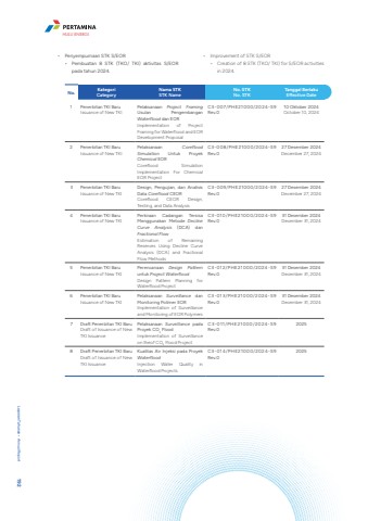 No. KategoriCategoryNama STKSTK NameNo. STKNo. STKTanggal BerlakuEffective Date1 Penerbitan TKI BaruIssuance of New TKI Pelaksanaan Project FramingUsulan Pengembangan Waterflood dan EORImplementation of Project Framing for Waterflood and EOR Development ProposalC3-007/PHE21000/2024-S9 Rev.010 Oktober 2024October 10, 20242 Penerbitan TKI BaruIssuance of New TKI Pelaksanaan Coreflood Simulation Untuk Proyek Chemical EORCoreflood Simulation Implementation For Chemical EOR ProjectC3-008/PHE21000/2024-S9 Rev.027 Desember 2024December 27, 20243 Penerbitan TKI BaruIssuance of New TKI Design, Pengujian, dan Analisis Data Coreflood CEORCoreflood CEOR Design, Testing, and Data AnalysisC3-009/PHE21000/2024-S9 Rev.027 Desember 2024December 27, 20244 Penerbitan TKI BaruIssuance of New TKI Perkiraan Cadangan Tersisa Menggunakan Metode Decline Curve Analysis (DCA) dan Fractional FlowEstimation of Remaining Reserves Using Decline Curve Analysis (DCA) and Fractional Flow MethodsC3-010/PHE21000/2024-S9 Rev.031 Desember 2024December 31, 20245 Penerbitan TKI BaruIssuance of New TKI Perencanaan Design Patternuntuk Project WaterfloodDesign Pattern Planning for Waterflood ProjectC3-012/PHE21000/2024-S9 Rev.031 Desember 2024December 31, 20246 Penerbitan TKI BaruIssuance of New TKI Pelaksanaan Surveillance dan Monitoring Polimer EORImplementation of Surveillance and Monitoring of EOR PolymersC3-013/PHE21000/2024-S9 Rev.031 Desember 2024December 31, 20247 Draft Penerbitan TKI BaruDraft of Issuance of New TKI IssuancePelaksanaan Surveillance pada Proyek CO2 FloodImplementation of Surveillance on theof CO2 Flood ProjectC3-011/PHE21000/2024-S9 Rev.020258 Draft Penerbitan TKI BaruDraft of Issuance of New TKI IssuanceKualitas Air Injeksi pada Proyek WaterfloodInjection Water Quality in Waterflood ProjectsC3-014/PHE21000/2024-S9 Rev.02025%u2022 Penyempurnaan STK S/EOR%u2022 Pembuatan 8 STK (TKO/ TKI) aktivitas S/EOR pada tahun 2024.%u2022 Improvement of STK S/EOR%u2022 Creation of 8 STK (TKO/ TKI) for S/EOR activities in 2024.Laporan Tahunan %u2022 Annual Report 192HULU ENERGI