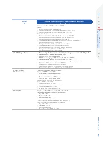 ProyekProjectPenjelasan Singkat dan Kemajuan Proyek Hingga Akhir Tahun 2024Brief Description and Project Progress Up to the End of 2024Total progress: Actual 30,4% vs Planned 30,4%Drilling:%u2022 Drilling Completed ED-14 drilling 100%%u2022 Drilling Completed ED-15 (Completion by HWU), July 12, 2024%u2022 Drilling Completed KUPL EQD-6 drilling 100% July 7, 2024Production Facilities:%u2022 Completed work in installing flowline & hook up spool ED-14%u2022 Completed work in installing flowline & hook up spool ED-15%u2022 Completed work in installing last spool KUPL EQD-6%u2022 Completed work on fabrication & installation of conductor support EF-10%u2022 Completed work on WHCP modification%u2022 Completed work on EF-10 deck material & fabrication%u2022 Completed work on EF-10 Fabrication & Installation%u2022 Completed work on EB-13 conductor support fabrication,%u2022 Completed work on EB-13 flowline fabrication%u2022 Completed work on EB-13 deck materialABG-GTR Stage-1 Phase 2 %u2022 Rencana Kerja Pemboran sudah selesai dikerjakan dengan bor terakhir ABG-C1 tajak 28%u2022 September 2023, release 08 November 2023%u2022 Rencana Kerja Flowline sudah 100%%u2022 EPC Stasiun Pengumpul ABG: Rencana 61.15%, Aktual 62.95%%u2022 Target onstream: Februari 2025 (Liquid), Mei 2025 (Gas)%u2022 Drilling Work Plan already completed with last drill being ABG-C1 28 drill bit.%u2022 September 2023, released November 08, 2023%u2022 Flowline Work Plan was already 100% complete%u2022 ABG Collector Station EPC: Planned 61,15%, Actual 62,95%%u2022 Onstream target: February 2025 (Liquid), May 2025 (Gas)OPLL WK MahakamOPLL Mahakam AreaTotal Progres Aktual 87% vs Rencana 86%Pemboran YTD Desember 2024:%u2022 Sumur tajak 43 vs Rencana 45 sumur%u2022 Sumur delivered 44 vs Rencana 46 sumur%u2022 Sumur convnected 44 vs 42 sumur%u2022 PCK-8B: Total Progres Aktual 100%Actual Progress Total 87% vs Planned 86%Drilling YTD December 2024:%u2022 43 wells vs Planned 45 wells%u2022 Delivered wells 44 vs Planned wells 46%u2022 Connected wells 44 vs 42 wells%u2022 PCK-8B: Total Actual Progress 100%OPLL 2C Infill Total Progres Fisik ITD: Rencana 67.88%, Aktual 70.3%Well Counting Aktual vs Rencana YTD Desember:%u2022 Spud: 21 vs 22%u2022 Delivered: 20 vs 20%u2022 Connected: 20 vs 22%u2022 Put on Production (POP): 27 vs 29Total ITD Physical Progress: Planned 67,88%, Actual 70,3%Well Counting Actual vs Planned YTD December:%u2022 Spud: 21 vs 22%u2022 Delivered: 20 vs 20%u2022 Connected: 20 vs 22%u2022 Put on Production (POP): 27 vs 29010203 04 Management Discussion & Analysis Pembahasan & Analisis Manajemen050607 PT Pertamina Hulu Energi 195