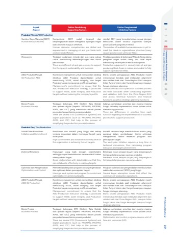 AspekAspectFaktor PendukungSupporting FactorsFaktor PenghambatInhibiting FactorsProduksi Minyak/ Oil ProductionSumber Daya Manusia (SDM)Human Resources (HR)Kompetensi SDM sudah terampil dan berpengalaman dalam mengelola lapangan migas baik onshore maupun offshore.Human resource competencies are skilled and experienced in managing oil and gas fields both onshore and offshore.Jumlah SDM yang tersedia belum sesuai dengan kebutuhan dalam struktur organisasi (banyak posisi vacant yang belum terisi).The number of available human resources is yet tomeet the needs in organizational structure (many vacant positions are yet to be filled).Resources Terdapat cadangan minyak dan gas yang cukup untuk mendukung keberlangsungan dan bisnis perusahaan.There are sufficient oil and gas reserves to support the Company's sustainability and business.Peralatan produksi di beberapa Wilayah Kerja utama penghasil migas sudah usang dan tidak dapat mendukung secara penuh kebutuhan operasi.Production equipment in several main oil and gas producing Work Areas is mature and unable to fully support operational needs.ABO Produksi MinyakOil Production ABOKomitment manajemen untuk memastikan strategi eksekusi ABO Produksi diprioritaskan untuk mendukung HSSE, asset integrity, dan target Produksi tanpa mengurangi profit perusahaan.Management's commitment to ensure that the ABO Production execution strategy is prioritized to support HSSE, asset integrity, and Production targets without reducing the company's profits.Bisnis proses pengawasan ABO Produksi masih menemukan kendala saat melakukan alignmentdan validasi baik dari Zona-Region-SHU maupun lintas fungsi teknis dan fungsi keuangan maupun fungsi strategic planning.The ABO Production supervision business process still finds obstacles when conducting alignment and validation both from the Zone-Region-SHU and across technical functions and financial functions as well as strategic planning functions.Bisnis ProsesBusiness ProcessTerdapat beberapa STK (Sistem Tata Kelola) dan aplikasi digital (seperti: PROMAN, PROPAR, AIMS, dan IOC) yang membantu dalam proses penyederhanaan bisnis proses produksi.There are several STK (Governance Systems) and digital applications (such as: PROMAN, PROPAR, AIMS, and IOC) that help in the process of simplifying the production process business.Adanya perbedaan prioritas dari masing-masing fungsi terhadap implementasi bisnis proses untuk mendukung produksi.There are differences in priorities from each function regarding the implementation of business processes to support production.Produksi Gas/ Gas ProductionInisiatif dan KomitmenInitiative and CommitmentKomitmen dan inisiatif yang tinggi dari setiap jenjang organisasi dalam mencapai target yang ditetapkan.High commitment and initiative from every level of the organization in achieving the set targets.Inisiatif rencana kerja membutuhkan waktu yang panjang dalam pembahasan teknis sehingga menghambat dalam eksekusi program dan pencapaian target.The work plan initiative requires a long time in technical discussions, thus hampering program execution and target achievement.External Relations Hubungan yang baik dengan stakeholderssehingga dapat berkolaborasi secara efektif dalam mewujudkan target.Good relationships with stakeholders so that they can collaborate effectively in realizing targets.Beberapa issue serapan buyer yang berpengaruh terhadap kelangsungan operasi produksi.Beberapa issue serapan buyer yang berpengaruh terhadap kelangsungan operasi produksi.Optimasi dan PengendalianOptimization and ControlMemiliki tata kerja dan program untuk pengendalian dan optimasi dalam pencapaian target.Having a work system and program for control and optimization in achieving targets.Program optimasi dan pengendalian membutuhkan waktu dan resources (SDM) yang tinggi.Several buyer absorption issues that affect the continuity of production operations.ABO Produksi MinyakABO Oil ProductionKomitmen manajemen untuk memastikan strategi eksekusi ABO Produksi diprioritaskan untuk mendukung HSSE, asset integrity, dan target Produksi tanpa mengurangi profit perusahaan.Management commitment to ensure that the ABO Production execution strategy is prioritized to support HSSE, asset integrity, and Production targets without reducing company profits.Bisnis proses pengawasan ABO Produksi masih menemukan kendala saat melakukan alignmentdan validasi baik dari Zona-Region-SHU maupun lintas fungsi teknis dan fungsi keuangan maupun fungsi strategic planning.Bisnis proses pengawasan ABO Produksi masih menemukan kendala saat melakukan alignment dan validasi baik dari Zona-Region-SHU maupun lintas fungsi teknis dan fungsi keuangan maupun fungsi strategic planning.Bisnis ProsesBusiness ProcessTerdapat beberapa STK (Sistem Tata Kelola) dan aplikasi digital (seperti: PROMAN, PROPAR, AIMS, dan IOC) yang membantu dalam proses penyederhanaan bisnis proses produksi.There are several STK (Governance Systems) and digital applications (such as: PROMAN, PROPAR, AIMS, and IOC) that help in the process of simplifying the production process business.Adanya perbedaan prioritas dari masing-masing fungsi terhadap implementasi bisnis proses untuk mendukung produksi.Optimization and control programs require a lot of time and resources (HR).010203 04 Management Discussion & Analysis Pembahasan & Analisis Manajemen050607 PT Pertamina Hulu Energi 201