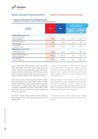 Realisasi Lifting Migas PHE Subholding Upstream Realisasi Lifting Migas PHE Subholding UpstreamRealisasi Lifting Migas PHE Subholding UpstreamRealization of Oil and Gas Lifting for PHE Subholding UpstreamDeskripsiDescription 2024 2023Kenaikan (Penurunan)Increase (Decrease)NominalAmountPersentasePercentage(%)Jumlah Lifting/ Lifting AmountLifting Minyak (MMBO)Oil Lifting (MMBO) 203,31 206,65 (3,34) (1,62) %uf0e2Lifting Gas Bumi (BSCF)Gas Lifting (BSCF) 731,49 717,39 14,10 1,96 %uf0e1Migas (MMBOE)Oil and Gas (MMBOE) 329,57 330,47 (0,91) (0,27) %uf0e2Lifting per Hari/ Lifting Per DayLifting Minyak (MBOPD)Oil Lifting (MBOPD) 555,49 566,17 (10,67) (1,88) %uf0e2Lifting Gas Bumi (MMSCFD)Gas Lifting (MMSCFD) 1.998,60 1.965,46 33,14 1,69 %uf0e1Migas (MBOEPD)Oil and Gas (MBOEPD) 900,45 905,40 (4,95) (0,55) %uf0e2Lifting minyak tahun 2024 mengalami penurunan sebesar 1,62% dibandingkan tahun 2023 sejalan dengan penurunan produksi minyak. Untuk mengoptimalkan kinerja lifting minyak, dilakukan koordinasi intensif dengan SKK Migas dan pembeli terkait penjadwalan lifting dan juga dengan operator terminal terkait minimalisasi settling time dan deadstock akhir tahun.Lifting gas bumi tahun 2024 mengalami kenaikan sebesar 1,96% dibandingkan tahun 2023 sejalan dengan kenaikan produksi gas dan serapan gas yang optimal dari konsumen gas eksisting. Selain itu dilakukan juga optimasi gas sales dengan menawarkan pengambilan gas pada volume JPMH (Jumlah Penyerahan Maksimum Harian) sesuai dengan Perjanjian Jual Beli Gas yang disepakati. Perusahaan mencatat adanya beberapa faktor pendukung dan penghambat kinerja Lifting Migas sepanjang tahun 2024 sebagai berikut.Oil lifting in 2024 decreased by 1.62% compared to 2023 in line with the decrease in oil production. To optimize oil lifting performance, intensive coordination was carried out with SKK Migas and buyers regarding lifting scheduling and also with terminal operators regarding minimizing settling time and year-end deadstock.Natural gas lifting in 2024 increased by 1.96% compared to 2023 in line with the increase in gas production and optimal gas absorption from existing gas consumers. In addition, gas sales optimization was also carried out by offering gas intake at JPMH (Maximum Daily Delivery Amount) volumes in accordance with the agreed Gas Sales and Purchase Agreement.The Company recorded several supporting and inhibiting factors for Oil and Gas Lifting performance throughout 2024 as follows.Laporan Tahunan %u2022 Annual Report 202HULU ENERGI
