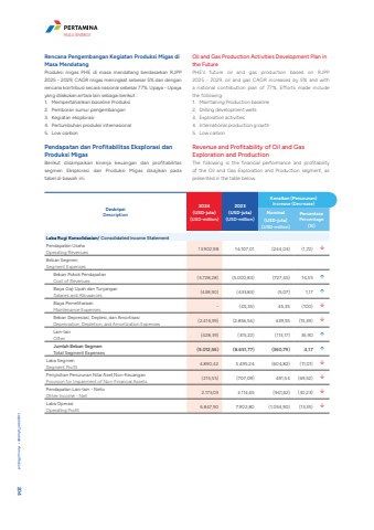 Rencana Pengembangan Kegiatan Produksi Migas di Masa MendatangProduksi migas PHE di masa mendatang berdasarkan RJPP 2025 - 2029, CAGR migas meningkat sebesar 5% dan dengan rencana kontribusi secara nasional sebesar 77%. Upaya - Upaya yang dilakukan antara lain sebagai berikut :1. Mempertahankan baseline Produksi2. Pemboran sumur pengembangan3. Kegiatan eksplorasi4. Pertumbuhan produksi internasional5. Low carbonPendapatan dan Profitabilitas Eksplorasi dan Produksi MigasBerikut disampaikan kinerja keuangan dan profitabilitas segmen Eksplorasi dan Produksi Migas disajikan padatabel di bawah ini.Oil and Gas Production Activities Development Plan in the FuturePHE's future oil and gas production based on RJPP 2025 - 2029, oil and gas CAGR increased by 5% and with a national contribution plan of 77%. Efforts made include the following:1. Maintaining Production baseline2. Drilling development wells3. Exploration activities4. International production growth5. Low carbonRevenue and Profitability of Oil and Gas Exploration and ProductionThe following is the financial performance and profitability of the Oil and Gas Exploration and Production segment, as presented in the table below.DeskripsiDescription2024(USD-juta)(USD-million)2023(USD-juta)(USD-million)Kenaikan (Penurunan)Increase (Decrease)Nominal(USD-juta) (USD-million)PersentasePercentage(%)Laba Rugi Konsolidasian/ Consolidated Income StatementPendapatan UsahaOperating Revenues 13.902,98 14.107,01 (244,03) (1,72) %uf0e2Beban SegmenSegment ExpensesBeban Pokok PendapatanCost of Revenues (5.728,28) (5.000,83) (727,45) 14,55 %uf0e1Biaya Gaji Upah dan TunjanganSalaries and Allowances (438,90) (433,83) (5,07) 1,17 %uf0e1Biaya PemeliharaanMaintenance Expenses - (45,35) 45,35 (100) %uf0e2Beban Depresiasi, Deplesi, dan AmortisasiDepreciation, Depletion, and Amortization Expenses (2.416,99) (2.856,54) 439,55 (15,39) %uf0e2Lain-lainOther (428,39) (315,22) (113,17) 35,90 %uf0e1Jumlah Beban SegmenTotal Segment Expenses (9.012,56) (8.651,77) (360,79) 4,17 %uf0e1Laba SegmenSegment Profit 4.890,42 5.495,24 (604,82) (11,01) %uf0e2Penyisihan Penurunan Nilai Aset Non-KeuanganProvision for Impairment of Non-Financial Assets (215,55) (707,09) 491,54 (69,52) %uf0e2Pendapatan Lain-lain - NetoOther Income - Net 2.173,03 3.114,65 (941,62) (30,23) %uf0e2Laba OperasiOperating Profit 6.847,90 7.902,80 (1.054,90) (13,35) %uf0e2Laporan Tahunan %u2022 Annual Report 204HULU ENERGI