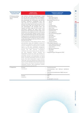 Anak Perusahaan (AP)Subsidiaries (AP)Kegiatan UsahaBusiness ActivitiesProduk dan Layanan JasaProducts and ServicePT Pertamina Drilling Services Indonesia (PDSI)Jasa aktivitas penunjang pertambangan minyak bumi dan gas alam, pertambangan dan penggalian, jasa reparasi dan pemasangan mesin dan peralatan, jasa pergudangan dan penyimpanan, jasa aktivitas konsultasi manajemen, perdagangan besar atas dasar balas jasa, jasa pengelolaan air limbah, jasa aktivitas komunikasi lainnya, jasa keinsinyuran serta konsultasi teknis YBDI, jasa sertifikasi dan uji tenis, jasa pembongkaran dan penyiapan lahan, jasa angkutan laut dalam negeri liner dan tramper untuk penumpang, angkutan laut dalam negeri untuk barang umum dan angkutan laut dalam negeri untuk barang khusus, jasa angkutan bermotor untuk barang khusus, jasa penunjang angkutan perairan lainnya, jasa usaha pertambangan gas alam dan pengusahaan tenaga panas bumi, jasa pelatihan kerja teknik swasta dan pelatihan kerja perusahaan lainnya, jasa sertifikasi profesi pihak ketiga, jasa aktivitas profesional, ilmiah dan teknis lainnya YTD.Oil and natural gas mining support services, mining and excavation, repair and installation services for machinery and equipment, warehousing and storage services, management consulting services, wholesale trade on a fee basis, wastewater management services, other communication services, engineering services and YBDI technical consultations, certification and tennis testing services, demolition and land preparation services, domestic sea transportation services for liners and trampers for passengers, domestic sea transportation for general goods and domestic sea transportation for special goods, motorized transportation services for special goods, other water transportation support services, natural gas mining and geothermal energy business services, private engineering job training services and other company job training, third party professional certification services, other professional, scientific and technical activity services YTD.%u2022 Rig Services%u2022 Rental Rigs Onshore%u2022 Rental Rigs Offshore%u2022 Associated Drilling Services%u2022 Top Drive%u2022 Fishing%u2022 Coring%u2022 H2S Monitoring%u2022 Directional Drilling%u2022 Water Pump%u2022 Aerated Drilling Unit%u2022 Cementing Unit%u2022 Mud Logging Unit%u2022 Real Time Monitoring Sytem%u2022 Centrifuge%u2022 Geomechanics%u2022 Mud Cooler%u2022 Mud Containment%u2022 Cutting Dryer%u2022 Cooling Container%u2022 Other Support Services%u2022 Pusat Logistik Berikat (PLB)%u2022 Indonesia Drilling Training%u2022 Center (IDTC)%u2022 Rig Hoist maintenance%u2022 Flow Meter%u2022 Fracturing%u2022 Integrated Project Management (IPM)PT Badak NGL KomersilCommercial%u2022 Technical services%u2022 Commissioning and start-up assistance(CSUA)%u2022 Operations & maintenance (O&M) services%u2022 TrainingProduksiProduction%u2022 LNG%u2022 LPG%u2022 Kondensat/Condensate010203 04 Management Discussion & Analysis Pembahasan & Analisis Manajemen050607 PT Pertamina Hulu Energi 207