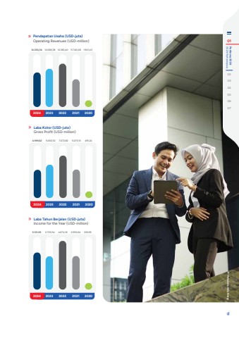 14.330,34 14.568,38 16.183,40 11.740,08 1.901,432024 2023 2022 2021 20204.999,62 5.650,52 7.672,82 5.073,13 419,242024 2023 2022 2021 20203.121,03 2.725,54 4.674,16 2.952,64 223,962024 2023 2022 2021 2020Laba Kotor (USD-juta)Gross Profit (USD-million)Laba Tahun Berjalan (USD-juta)Income for the Year (USD-million)Pendapatan Usaha (USD-juta)Operating Revenues (USD-million) 01 2024 Performance Performa 2024020304050607 PT Pertamina Hulu Energi 19