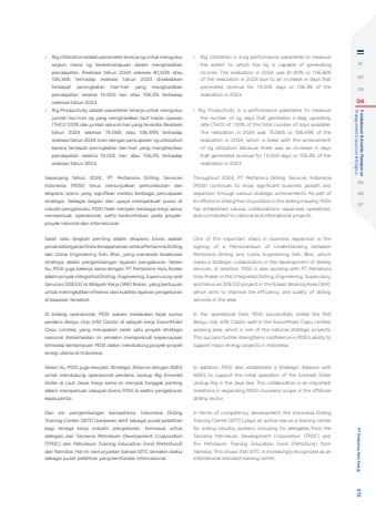%u2022 Rig Utilization adalah parameter kinerja rig untuk mengukur sejauh mana rig berkemampuan dalam menghasilkan pendapatan. Realisasi tahun 2024 sebesar 81,40% atau 106,36% terhadap realisasi tahun 2023 disebabkan terdapat peningkatan hari-hari yang menghasilkan pendapatan selama 14.005 hari atau 106,3% terhadap realisasi tahun 2023.%u2022 Rig Productivity adalah parameter kinerja untuk mengukur jumlah hari-hari rig yang menghasilkan tarif harian operasi (THO) 100% dari jumlah seluruh hari yang tersedia. Realisasi tahun 2024 sebesar 75,06% atau 106,49% terhadap realisasi tahun 2024 linier dengan pencapaian rig utilizationkarena terdapat peningkatan hari-hari yang menghasilkan pendapatan selama 14.005 hari atau 106,3% terhadap realisasi tahun 2023.Sepanjang tahun 2024, PT Pertamina Drilling Services Indonesia (PDSI) terus menunjukkan pertumbuhan dan ekspansi bisnis yang signifikan melalui berbagai pencapaian strategis. Sebagai bagian dari upaya memperkuat posisi di industri pengeboran, PDSI telah menjalin berbagai kerja sama, memperluas operasional, serta berkontribusi pada proyekproyek nasional dan internasional.Salah satu langkah penting dalam ekspansi bisnis adalah penandatanganan Nota Kesepahaman antara Pertamina Drilling dan Uzma Engineering Sdn. Bhd., yang menandai kolaborasi strategis dalam pengembangan layanan pengeboran. Selain itu, PDSI juga bekerja sama dengan PT Pertamina Hulu Rokan dalam proyek Integrated Drilling, Engineering, Supervisory and Services (IDESS) di Wilayah Kerja (WK) Rokan, yang bertujuan untuk meningkatkan efisiensi dan kualitas layanan pengeboran di kawasan tersebut.Di bidang operasional, PDSI sukses melakukan tajak sumur perdana Banyu Urip Infill Clastic di wilayah kerja ExxonMobil Cepu Limited, yang merupakan salah satu proyek strategis nasional. Keberhasilan ini semakin memperkuat kepercayaan terhadap kemampuan PDSI dalam mendukung proyek-proyek energi utama di Indonesia.Selain itu, PDSI juga menjalin Strategic Alliance dengan ADES untuk mendukung operasional perdana Jackup Rig Emerald Driller di Laut Jawa. Kerja sama ini menjadi tonggak penting dalam memperluas cakupan bisnis PDSI di sektor pengeboran lepas pantai.Dari sisi pengembangan kompetensi, Indonesia Drilling Training Center (IDTC) berperan aktif sebagai pusat pelatihan bagi tenaga kerja industri pengeboran, termasuk untuk delegasi dari Tanzania Petroleum Development Corporation(TPDC) dan Petroleum Training Education Fund (Petrofund) dari Namibia. Hal ini menunjukkan bahwa IDTC semakin diakui sebagai pusat pelatihan yang berstandar internasional.%u2022 Rig Utilization is a rig performance parameter to measure the extent to which the rig is capable of generating income. The realization in 2024 was 81.40% or 106.36% of the realization in 2023 due to an increase in days that generated revenue for 14,005 days or 106.3% of the realization in 2023.%u2022 Rig Productivity is a performance parameter to measure the number of rig days that generates a daily operating rate (THO) of 100% of the total number of days available. The realization in 2024 was 75.06% or 106.49% of the realization in 2024, which is linear with the achievement of rig utilization because there was an increase in days that generated revenue for 14,005 days or 106.3% of the realization in 2023.Throughout 2024, PT Pertamina Drilling Services Indonesia (PDSI) continues to show significant business growth and expansion through various strategic achievements. As part of its efforts to strengthen its position in the drilling industry, PDSI has established various collaborations, expanded operations, and contributed to national and international projects.One of the important steps in business expansion is the signing of a Memorandum of Understanding between Pertamina Drilling and Uzma Engineering Sdn. Bhd., which marks a strategic collaboration in the development of drilling services. In addition, PDSI is also working with PT Pertamina Hulu Rokan in the Integrated Drilling, Engineering, Supervisory and Services (IDESS) project in the Rokan Working Area (WA), which aims to improve the efficiency and quality of drilling services in the area.In the operational field, PDSI successfully drilled the first Banyu Urip Infill Clastic well in the ExxonMobil Cepu Limited working area, which is one of the national strategic projects. This success further strengthens confidence in PDSI's ability to support major energy projects in Indonesia.In addition, PDSI also established a Strategic Alliance with ADES to support the initial operation of the Emerald Driller Jackup Rig in the Java Sea. This collaboration is an important milestone in expanding PDSI's business scope in the offshore drilling sector.In terms of competency development, the Indonesia Drilling Training Center (IDTC) plays an active role as a training center for drilling industry workers, including for delegates from the Tanzania Petroleum Development Corporation (TPDC) and the Petroleum Training Education Fund (Petrofund) from Namibia. This shows that IDTC is increasingly recognized as an international standard training center.010203 04 Management Discussion & Analysis Pembahasan & Analisis Manajemen050607 PT Pertamina Hulu Energi 213