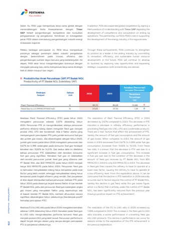 Selain itu, PDSI juga memperluas kerja sama global dengan menandatangani Nota Kesepahaman dengan Timor GAP terkait pengembangan kompetensi dan konsultasi pengoperasian rig pengeboran. Kemitraan ini menegaskan peran PDSI dalam mendukung pengembangan industri energi di kawasan regional.Melalui berbagai pencapaian ini, PDSI terus memperkuat posisinya sebagai pemimpin dalam industri pengeboran dengan berkomitmen pada inovasi, efisiensi, dan pengembangan sumber daya manusia yang berkelanjutan. Ke depan, PDSI akan terus mengembangkan bisnisnya dengan menjajaki peluang baru serta memperluas kerja sama strategis baik di dalam maupun luar negeri.In addition, PDSI also expanded global cooperation by signing a Memorandum of Understanding with Timor GAP regarding the development of competence and consultation on drilling rig operations. This partnership confirms PDSI's role in supporting the development of the energy industry in the regional area.Through these achievements, PDSI continues to strengthen its position as a leader in the drilling industry by committing to innovation, efficiency, and sustainable human resource development. In the future, PDSI will continue to develop its business by exploring new opportunities and expanding strategic cooperation both domestically and abroad.Realisasi Plant Thermal Efficiency (PTE) pada tahun 2024 mengalami penurunan sebesar 0,67% dibanding tahun 2023. Penurunan PTE ini mengindikasikan adanya penurunan performa efisiensi kilang dalam mengolah feed gas menjadi produk LNG, LPG dan kondensat. Ada 2 faktor utama yang mempengaruhi pencapaian PTE yaitu jumlah konsumsi fuel gas dan jumlah gas losses. Jika dibandingkan dengan tahun 2023, jumlah gas losses pada tahun 2024 mengalami penurunan dari 0,67% ke 0,39% sedangkan pada konsumsi fuel gas terdapat kenaikan dari 13,65% ke 14,51%. Dari kedua data ini diketahui bahwa penurunan PTE diakibatkan oleh kenaikan konsumsi fuel gas yang signifikan. Kenaikan fuel gas ini diakibatkan oleh kondisi penurunan jumlah feed gas yang diterima oleh PT Badak NGL dari 822 MMSCFD pada tahun 2023 menjadi hanya 633 MMSCFD pada tahun 2024. Penurunan feed gasini kemudian menyebabkan kilang harus beroperasi pada load factor yang lebih rendah sehingga menyebabkan kilang harus beroperasi pada tingkat efisiensi yang rendah. Dari penjelasan di atas dapat disimpulkan bahwa penurunan realisasi PTE pada tahun 2024 pada dasarnya terjadi karena faktor di luar kendali PT Badak NGL yaitu dari penurunan feed gas sedangkan angka gas losses yang merupakan faktor yang sepenuhnya ada di bawah kendali PT Badak NGL, berhasil diturunkan secara signifikan dibandingkan tahun sebelumnya (berdampak positif terhadap pencapaian PTE).Realisasi FG to LNG ratio pada tahun 2024 mengalami kenaikan sebesar 1,29% dibanding tahun 2023. Kenaikan pada feed gas to LNG ratio mengindikasikan performa konversi feed gasmenjadi produk LNG yang lebih buruk. Penurunan performa ini dapat terjadi dengan alasan yang serupa dengan pencapaian PTE di penjelasan sebelumnya.The realization of Plant Thermal Efficiency (PTE) in 2024 decreased by 0.67% compared to 2023. This decrease in PTE indicates a decrease in refinery efficiency performance in processing feed gas into LNG, LPG and condensate products. There are 2 main factors that affect the achievement of PTE, namely the amount of fuel gas consumption and the amount of gas losses. When compared to 2023, the amount of gas losses in 2024 decreased from 0.67% to 0.39% while fuel gas consumption increased from 13.65% to 14.51%. From these two data, it is known that the decrease in PTE was due to a significant increase in fuel gas consumption. This increase in fuel gas was due to the condition of the decrease in the amount of feed gas received by PT Badak NGL from 822 MMSCFD in 2023 to only 633 MMSCFD in 2024. This decrease in feed gas then caused the refinery to have to operate at a lower load factor, causing the refinery to have to operate at a low efficiency level. From the explanation above, it can be concluded that the decline in PTE realization in 2024 basically occurred due to factors beyond the control of PT Badak NGL, namely the decline in gas feed, while the gas losses figure, which is a factor that is entirely under the control of PT Badak NGL, has been significantly reduced from the previous year (having a positive impact on PTE achievement).The realization of the FG to LNG ratio in 2024 increased by 1.29% compared to 2023. The increase in the feed gas to LNG ratio indicates a worse performance in converting feed gas into LNG products. This decline in performance can occur for reasons similar to the explanation of the PTE achievement in the previous explanation.Produktivitas Anak Perusahaan (AP) PT Badak NGLProductivity of PT Badak NGL Subsidiary (AP)DeskripsiSubjectSatuanUnit 2024 2023Kenaikan (Penurunan)Increase (Decrease)PersentasePercentage(%)Plant Thermal Efficiency % 85,10 85,68 (0,68) %uf0e2Feed Gas to LG (MMSCF/1000 m2) % 27,45 27,10 1,29 %uf0e1Laporan Tahunan %u2022 Annual Report 214HULU ENERGI