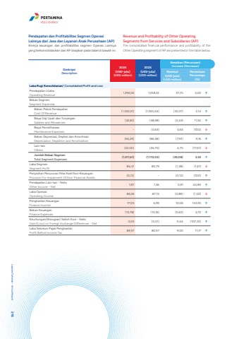 DeskripsiDescription2024(USD-juta)(USD-million)2023(USD-juta)(USD-million)Kenaikan (Penurunan)Increase (Decrease)Nominal(USD-juta)(USD-million)PersentasePercentage(%)Laba Rugi Konsolidasian/ Consolidated Profit and LossPendapatan UsahaOperating Revenue 1.296,02 1.258,32 37,70 3,00 %uf0e1Beban SegmenSegment ExpensesBeban Pokok Pendapatan Cost Of Revenue (1.052,51) (1.020,44) (32,07) 3,14 %uf0e1Biaya Gaji Upah dan Tunjangan Salaries and Allowances (42,81) (38,38) (4,43) 11,54 %uf0e1Biaya Pemeliharaan Maintenance Expenses - (0,63) 0,63 (100) %uf0e2Beban Depresiasi, Deplesi dan AmortisasiDepreciation, Depletion and Amortization (94,29) (86,38) (7,91) 9,16 %uf0e1Lain-lainOthers (22,00) (26,70) 4,70 (17,61) %uf0e2Jumlah Beban SegmenTotal Segment Expenses (1.211,61) (1.172,53) (39,08) 3,33 %uf0e1Laba SegmenSegment Profit 84,41 85,79 (1,38) (1,61) %uf0e2Penyisihan Penurunan Nilai Aset Non-KeuanganProvision For Impairment Of Non-Financial Assets (0,12) - (0,12) (100) %uf0e1Pendapatan Lain-lain - NetoOther Income - Net 1,97 1,36 0,61 44,85 %uf0e1Laba OperasiOperating Income 86,26 87,15 (0,89) (1,02) %uf0e2Penghasilan Keuangan Finance Income 17,05 6,99 10,06 143,93 %uf0e1Beban Keuangan Finance Expenses (13,78) (13,16) (0,62) 4,72 %uf0e1Keuntungan/(Kerugian) Selisih Kurs - NetoGain/(Loss) on Foreign Exchange Differences - Net 0,03 (0,41) 0,44 (107,32) %uf0e1Laba Sebelum Pajak PenghasilanProfit Before Income Tax 89,57 80,57 9,00 11,17 %uf0e1Pendapatan dan Profitabilitas Segmen Operasi Lainnya dari Jasa dan Layanan Anak Perusahaan (AP)Kinerja keuangan dan profitabilitas segmen Operasi Lainnya yang terkonsolidasikan dari AP disajikan pada tabel di bawah ini.Revenue and Profitability of Other Operating Segments from Services and Subsidiaries (AP)The consolidated financial performance and profitability of the Other Operating segment of AP are presented in the table below.Laporan Tahunan %u2022 Annual Report 218HULU ENERGI