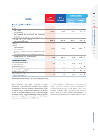 Rasio Profitabilitas tahun 2024 cenderung meningkat dibandingkan dengan tahun 2023, disebabkan karena kegiatan distribusi bahan bakar dan aktivitas jasa pengeboran. Meski pendapatan segmen bertumbuh pada tahun 2024, namun tidak setinggi pertumbuhan pada tahun 2023. Dengan peningkatan pendapatan segmen tersebut, laba sebelum pajak tahun 2024 juga turut meningkat 11% sebesar USD9 juta dibandingkan dengan laba tahun 2023 sebesar USD80,57 juta.The Profitability Ratio in 2024 tends to increase compared to 2023, due to fuel distribution activities and drilling service activities. Although segment revenue grew in 2024, it is not as high as the growth in 2023. With the increase in segment revenue, profit before tax in 2024 also increased by 11% by USD9 million compared to profit in 2023 of USD80.57 million.Keterangan: kinerja keuangan pada tabel di atas merupakan angka sebelum eliminasi.Remarks: the financial performance in the table above constitutes figures before elimination.DeskripsiDescription2024(USD-juta)(USD-million)2023(USD-juta)(USD-million)Kenaikan (Penurunan)Increase (Decrease)Nominal(USD-juta)(USD-million)PersentasePercentage(%)Posisi Keuangan/ Financial PositionAsetAssetsAset Segmen Segment assets 1.495,03 1.346,20 148,83 11,06 %uf0e1Aset Perusahaan dan Entitas Anak yang Tidak Dapat DialokasikanUnallocated Assets of the Company and Subsidiaries- - -Jumlah aset yang dikonsolidasikanTotal consolidated assets 1.495,03 1.346,20 148,83 11,06 %uf0e1LiabilitasLiabilitiesLiabilitas Segmen Segment Liabilities 717,64 593,48 124,16 20,92 %uf0e1Liabilitas Perusahaan dan Entitas Anak yang Tidak Dapat DialokasikanUnallocated Liabilities of the Company and Subsidiaries- - -Jumlah Liabilitas yang DikonsolidasikanTotal Consolidated Liabilities 717,64 593,48 124,16 20,92 %uf0e1Profitabilitas/ ProfitabilityPertumbuhan Pendapatan (%)Revenue Growth (%) 3,00 7,75 (4,76) (61,35) %uf0e2Imbal Balik atas Aset (%)Return on Assets (%) 5,99 5,98 0,01 0,10 %uf0e1Margin Laba Sebelum Pajak (%)Profit Margin Before Tax (%) 6,91 6,40 0,51 7,94 %uf0e1Margin Laba Operasi (%)Operating Profit Margin (%) 6,66 6,93 (0,27) (3,90) %uf0e2010203 04 Management Discussion & Analysis Pembahasan & Analisis Manajemen050607 PT Pertamina Hulu Energi 219