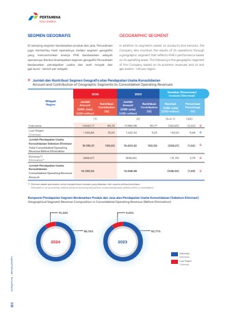 SEGMEN GEOGRAFISDi samping segmen berdasarkan produk dan jasa, Perusahaan juga memantau hasil operasinya melalui segmen geografis yang mencerminkan kinerja PHE berdasarkan wilayah operasinya. Berikut disampaikan segmen geografis Perusahaan berdasarkan pendapatan usaha dan aset minyak dan gas bumi - bersih per wilayah.GEOGRAPHIC SEGMENTIn addition to segments based on products and services, the Company also monitors the results of its operations through a geographic segment that reflects PHE's performance based on its operating areas. The following is the geographic segment of the Company based on its business revenues and oil and gas assets - net per region.WilayahRegion2024 2023 Kenaikan (Penurunan)Increase (Decrease)JumlahAmount(USD-Juta)(USD-million)KontribusiContribution(%)JumlahAmount(USD-Juta)(USD-million)KontribusiContribution(%)Nominal (USD-Juta)(USD-million)PersentasePercentage(%)(1) (2) (3=2-1) (3/2)Indonesia 13.642,17 89,76 13.982,98 90,77 (340,81) (2,44) %uf0e2Luar NegeriOverseas 1.556,84 10,24 1.422,34 9,23 134,50 9,46 %uf0e1Jumlah Pendapatan Usaha Konsolidasian Sebelum EliminasiTotal Consolidated Operating Revenue Before Elimination15.199,01 100,00 15.405,32 100,00 (206,31) (1,34) %uf0e2Eliminasi*)Elimination* (868,67) (836,94) (31,73) 3,79 %uf0e2Jumlah Pendapatan Usaha KonsolidasianConsolidated Operating Revenue Amount14.330,34 14.568,38 (238,04) (1,63) %uf0e2Jumlah dan Kontribusi Segmen Geografis atas Pendapatan Usaha Konsolidasian Amount and Contribution of Geographic Segments to Consolidated Operating Revenues*) Eliminasi adalah pencatatan untuk mengeliminasi transaksi yang dilakukan oleh sesama entitas konsolidasi.Elimination is an accounting method aimed at removing transactions conducted between entities within a consolidation. Komposisi Pendapatan Segmen Berdasarkan Produk dan Jasa atas Pendapatan Usaha Konsolidasian (Sebelum Eliminasi)Geographical Segment Revenue Composition in Consolidated Operating Revenue (Before Elimination)Indonesia IndonesiaLuar NegeriOverseas90,77%9,23%2023 89,76%10,24%2024 Laporan Tahunan %u2022 Annual Report 222HULU ENERGI