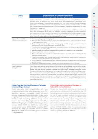 ProdukProductStrategi Pemasaran yang Dikembangkan PerusahaanThe Marketing Strategies Developed by the CompanyUpstream Subholding has several subsidiaries that are LNG producers, namely PT Pertamina Hulu Mahakam (PHM), PT Pertamina Hulu Sanga Sanga (PHSS) and PT Pertamina Hulu Kalimantan Timur (PHKT) which are under PT Pertamina Hulu Indonesia (PHI). PHM, PHSS and PHKT operate in the East Kalimantan area so that they have the main obligation to meet the needs of domestic pipeline gas in the East Kalimantan area while the excess gas that is still available is channeled to the Bontang LNG Plant operated by PT Badak NGL.LNG marketing for the PHI group is carried out jointly with the LNG Function of PT Pertamina (Persero) which acts simultaneously as the State LNG Seller and Contractor. Meanwhile, LNG lifting operations and implementation of other LNG contract aspects for the East Kalimantan area are managed through the Joint Management Group (JMG) entity consisting of representatives of Pertamina (Persero), PHM, PHSS, PHKT, ENI Muara Bakau, ENI East Sepinggan and ENI Rapak.Layanan Komersial LNGLNG Commercial Services%u2022 Memberdayakan jaringan bisnis yang ada.%u2022 Partisipasi aktif dalam berbagai event migas nasional dan internasional, serta berkoordinasi dengan Pertamina Business Forum.%u2022 Kerja sama pemasaran dengan mitra strategis yang memiliki jaringan operasional maupun keanggotaan luas, di antaranya Indonesia Gas Society (IGS).%u2022 Pemasaran aktif kepada calon pengguna jasa, terutama perusahaan-perusahaan yang sedang dalam masa pembangunan kilang LNG.%u2022 Mengembangkan kanal pemasaran berbasis daring melalui situs web khusus dan sosial media.%u2022 Empowering existing business networks.%u2022 Active participation in various national and international oil and gas events, and coordinating with the Pertamina Business Forum.%u2022 Marketing cooperation with strategic partners who have extensive operational and membership networks, including the Indonesia Gas Society (IGS).%u2022 Active marketing to potential service users, especially companies that are in the process of building an LNG refinery.%u2022 Developing online-based marketing channels through special websites and social media.Jasa PengeboranDrilling ServicesFokus utama pada optimasi pemanfaatan aset eksisting dan pengembangan captive market dengan penambahan investasi aset baru dan skema kemitraan dengan strategic partner serta mengedepankan konsep one stop services company di bidang hulu migas melalui penerapan Integrated Project Management, Integrated Drilling Services, dan Integrated Drilling Engineering Services & Supervisory.The main focus is on optimizing the utilization of existing assets and developing captive markets by adding new asset investments and partnership schemes with strategic partners and prioritizing the concept of a one-stop services company in the upstream oil and gas sector through the implementation of Integrated Project Management, Integrated Drilling Services, and Integrated Drilling Engineering Services & Supervisory.Pangsa Pasar dan Kontribusi Perusahaan Terhadap Ketahanan Migas NasionalMelalui kerja nyata, masif, mengoptimalkan, serta terus mengeksplorasi potensi dan peluang sepanjang tahun, PHE Subholding Upstream mencatatkan kinerja operasional yang baik hingga dapat berkontribusi positif menjadi tulang punggung pencapaian produksi minyak dan gas bagi Negara. Kontribusi untuk mendukung ketahanan energi nasional tercermin dari realisasi lifting migas nasional selama tahun 2024. Total lifting minyak domestik PHE Subholding Upstreammencapai 399,89 MBOPD atau 68,98% dari realisasi liftingminyak nasional sebesar 579,70 MBOPD pada tahun 2024. Sementara itu, lifting gas domestik mencapai 1.837,68 MMSCFD atau 33,53% dari realisasi lifting gas nasional sebesar 5.481,00 MMSCFD.Market Share and Contribution of Company to National Oil and Gas ResilienceThrough real, massive work, optimizing, and continuing to explore potential and opportunities throughout the year, PHE Subholding Upstream recorded good operational performance so that it could contribute positively to becoming the backbone of achieving oil and gas production for the State. The contribution to supporting national energy resilience is reflected in the realization of national oil and gas lifting during 2024. PHE Subholding Upstream's total domestic oil lifting reached 399.89 MBOPD or 68.98% of the realization of national oil lifting of 579.70 MBOPD in 2024. Meanwhile, domestic gas lifting reached 1,837.68 MMSCFD or 33.53% of the realization of national gas lifting of 5,481.00 MMSCFD.010203 04 Management Discussion & Analysis Pembahasan & Analisis Manajemen050607 PT Pertamina Hulu Energi 225