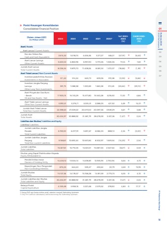 (Dalam Jutaan USD)(In Million USD) 2024 2023 2022 2021 2020*)YoY 2023-2024(%)CAGR 2020-2024(%)Aset/ AssetsAset Lancar/ Current AssetsKas dan Setara KasCash and Cash Equivalents 2.614,32 5.018,74 4.456,36 3.211,27 346,01 (47,91) %uf0e2 (6,63) %uf0e1Aset Lancar LainnyaOther Current Assets 5.422,02 4.860,96 6.951,90 5.170,26 1.026,06 11,54 %uf0e1 1,60 %uf0e1Jumlah Aset LancarTotal Current Assets 8.036,34 9.879,70 11.408,26 8.381,53 1.372,07 (18,66) %uf0e2 (1,39) %uf0e2Aset Tidak Lancar/ Non Current AssetsInvestasi pada Entitas AsosiasiInvestments in Associates 511,42 514,24 645,73 609,06 310,38 (0,55) %uf0e2 (5,66) %uf0e2Investasi Jangka Panjang LainnyaOther Long Term Investments591,75 1.088,58 1.020,69 1.660,28 310,45 (45,64) %uf0e2 (29,10) %uf0e2Aset Minyak dan Gas Bumi - BersihOil and Gas Assets - Net17.905,15 16.130,29 15.371,80 15.540,28 3.216,92 11,00 %uf0e1 4,84 %uf0e1Aset Tidak Lancar LainnyaOther Non Current Assets 3.390,31 3.276,11 3.035,31 2.288,05 421,92 3,49 %uf0e1 14,01 %uf0e1Jumlah Aset Tidak LancarTotal Non Current Assets 22.398,63 21.009,22 20.073,53 20.097,06 3.949,29 6,61 %uf0e1 3,68 %uf0e1Jumlah AsetTotal Assets 30.434,97 30.888,92 31.481,79 28.478,59 5.321,36 (1,47) %uf0e2 2,24 %uf0e1Liabilitas dan Ekuitas/ Liabilities and Equity Liabilitas/ LiabilitiesJumlah Liabilitas Jangka PendekTotal Current Liabilities6.159,00 6.017,91 5.691,67 6.584,03 888,10 2,34 %uf0e1 (2,20) %uf0e2Jumlah Liabilitas Jangka PanjangTotal Non-current Liabilities9.168,61 10.692,44 10.631,84 8.502,97 1.659,54 (14,25) %uf0e2 2,54 %uf0e1Jumlah LiabilitasTotal Liabilities 15.327,61 16.710,35 16.323,51 15.087,00 2.547,64 (8,27) %uf0e2 0,53 %uf0e1Ekuitas yang Dapat Diatribusikan Kepada:Equity Attributable to:Pemilik Entitas IndukOwners of Holding Entity 14.433,12 13.534,14 14.618,81 12.935,95 2.750,94 6,64 %uf0e1 3,72 %uf0e1Kepentingan Non-PengendaliNon-Controlling Interests 674,24 644,43 539,47 455,64 22,79 4,63 %uf0e1 13,95 %uf0e1Jumlah EkuitasTotal Equity 15.107,36 14.178,57 15.158,28 13.391,59 2.773,73 6,55 %uf0e1 4,10 %uf0e1Jumlah Liabilitas dan EkuitasTotal Liabilities and Equity 30.434,97 30.888,92 31.481,79 28.478,59 5.321,36 (1,47) %uf0e2 2,24 %uf0e1Belanja ModalCapital Expenditure 4.149,48 3.958,16 3.221,48 2.579,52 378,90 4,83 %uf0e1 17,17 %uf0e1Posisi Keuangan KonsolidasianConsolidated Financial Position*) Hanya PHE saja (tanpa entitas anak), sebelum menjadi Subholding Upstream*) Only PHE (without subsidiaries), before becoming the Subholding Upstream01 2024 Performance Performa 2024020304050607 PT Pertamina Hulu Energi 21
