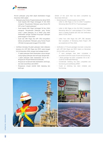 Rincian pekerjaan yang telah dapat diselesaikan hingga Desember 2024 adalah:%u2022 Pekerjaan yang Tersisa: Progres keseluruhan aktual 100%- Surat kepada SKK Migas tertanggal 31 Okt 2024 mengenai %u201cPenyelesaian Pekerjaan yang Tersisa PIS GPF untuk 17 paket pekerjaan%u201d.- Surat kepada SKK Migas tertanggal 18 Nov 2024 mengenai %u201cPenyelesaian Pekerjaan yang Tersisa untuk 1 paket pekerjaan Tie In Meter yang telah diselesaikan dengan Verifikasi Kunjungan Lapangan pada tanggal 3-4 Des 2024%u201d.- Surat dari SKK Migas (Ka UPP JTB) menyatakan bahwa penyelesaian Pekerjaan yang Tersisa Proyek JTB telah tercapai pada tanggal 27 Des 2024.%u2022 Verifikasi terhadap 18 paket pekerjaan telah dilakukan bersama tim UPP SKK Migas dan PEPC pada tanggal 03-04 Desember 2024, dengan hasil sebagai berikut:- 17 paket pekerjaan telah diselesaikan sesuai dengan ruang lingkup pekerjaan dan berfungsi dengan baik.- 1 paket pekerjaan telah diselesaikan (Tie-In BU - Pengukuran Minyak Mentah & Kondensat).- Pengukuran kondensat telah diselesaikan, berfungsi, dan telah disertifikasi oleh DIMET.- Pengukuran minyak mentah telah dipasang dan berfungsi.Details of the work that has been completed by December 2024 are:%u2022 Remaining work: Overall progress actual 100%- Letter to SKK Migas on Oct 31, 2024 %u201cCompletion Remaining Work PIS GPF for 17 work packages%u201d.- Letter to SKK Migas on Nov 18, 2024 %u201cCompletion Remaining Work for 1 work package of Tie In Meter which is already finalized with Site Visit Verification dated 3-4 Dec 2024\- Letter from SKK Migas (Ka UPP JTB) declared that completion of Remaining Work Project JTB accomplished at 27 Dec 2024.%u2022 Verification of 18 work packages has been conducted with UPP SKK Migas and PEPC teams on December 03-04, 2024, with the results:- 17 work packages have been completed in accordance with the scope of work and functioning - 1 Work package has been completed (Tie In BU - Crude & Condensate Metering).- Condensate metering has been completed and functioning and certified by DIMET.- Crude oil metering has been installed and functioning.Laporan Tahunan %u2022 Annual Report 228HULU ENERGI