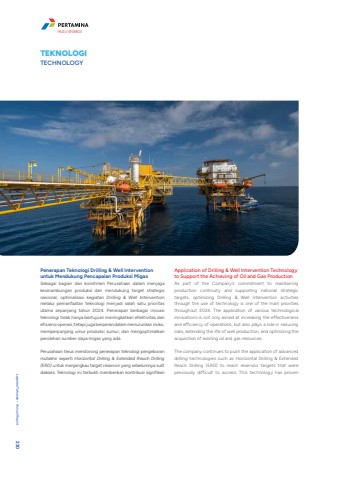 TEKNOLOGITECHNOLOGYPenerapan Teknologi Drilling & Well Intervention untuk Mendukung Pencapaian Produksi MigasSebagai bagian dari komitmen Perusahaan dalam menjaga kesinambungan produksi dan mendukung target strategis nasional, optimalisasi kegiatan Drilling & Well Interventionmelalui pemanfaatan teknologi menjadi salah satu prioritas utama sepanjang tahun 2024. Penerapan berbagai inovasi teknologi tidak hanya bertujuan meningkatkan efektivitas dan efisiensi operasi, tetapi juga berperan dalam menurunkan risiko, memperpanjang umur produksi sumur, dan mengoptimalkan perolehan sumber daya migas yang ada.Perusahaan terus mendorong penerapan teknologi pengeboran mutakhir seperti Horizontal Drilling & Extended Reach Drilling (ERD) untuk menjangkau target reservoir yang sebelumnya sulit diakses. Teknologi ini terbukti memberikan kontribusi signifikan Application of Drilling & Well Intervention Technology to Support the Achieving of Oil and Gas ProductionAs part of the Company's commitment to maintaining production continuity and supporting national strategic targets, optimizing Drilling & Well Intervention activities through the use of technology is one of the main priorities throughout 2024. The application of various technological innovations is not only aimed at increasing the effectiveness and efficiency of operations, but also plays a role in reducing risks, extending the life of well production, and optimizing the acquisition of existing oil and gas resources.The company continues to push the application of advanced drilling technologies such as Horizontal Drilling & Extended Reach Drilling (ERD) to reach reservoir targets that were Laporan Tahunan previously difficult to access. This technology has proven %u2022 Annual Report 230HULU ENERGI