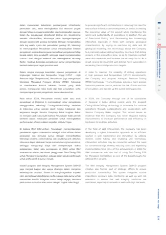 dalam menurunkan kebutuhan pembangunan infrastruktur permukaan baru, serta meningkatkan nilai ekonomi proyek dengan tetap menjaga keselamatan dan keberlanjutan operasi. Selain itu, penggunaan Directional Drilling dan Geosteeringsemakin diintensifkan, khususnya pada lapangan-lapangan dengan karakteristik geologi kompleks. Dengan mengandalkan data log waktu nyata dan pemodelan geologi 3D, teknologi ini memungkinkan Perusahaan untuk menyesuaikan lintasan pengeboran secara dinamis guna memastikan pengeboran tetap berada dalam zona produktif, sehingga dapat memaksimalkan contact area dengan reservoir dan meningkatkan recovery factor. Hasilnya, beberapa pengeboran sumur pengembangan berhasil melampaui target produksi awal.Dalam rangka menjaga keandalan operasi pengeboran di lingkungan tekanan dan temperatur tinggi (HPHT - High Pressure High Temperature), Perusahaan juga mengadopsi teknologi Managed Pressure Drilling (MPD). Teknologi ini memberikan kontrol tekanan formasi yang lebih presisi, mengurangi risiko kicks dan loss circulation, serta mempercepat proses pengeboran secara keseluruhan.Pada tahun 2024, Perusahaan melalui salah satu anak perusahaan di Regional 3, memecahkan rekor pengeboran menggunakan teknologi Casing-While-Drilling terdalam di Indonesia untuk operasi darat melalui kolaborasi dan kerjasama dengan Service Company Baker Hughes. Rekor ini menjadi salah satu bukti bahwa Perusahaan tidak pernah berhenti dalam melakukan perbaikan untuk meningkatkan performa dan efisiensi dalam kegiatan di Hulu Migas.Di bidang Well Intervention, Perusahaan mengembangkan pendekatan rigless intervention sebagai solusi efisien dalam perawatan dan stimulasi sumur. Dengan memanfaatkan teknologi slickline, coiled tubing, dan snubbing unit, aktivitas intervensi dapat dilakukan tanpa memerlukan rig konvensional, sehingga mengurangi biaya dan mempercepat waktu pelaksanaan. Salah satu pencapaian di 2024 untuk Well Intervention adalah percobaan penggunaan Thru-Tubing ESP untuk Monobore Completion, sebagai salah satu breakthrough untuk artificial lift di sumur minyak.Inisiatif program Well Integrity Management System (WIMS)juga menjadi bagian dari upaya strategis dalam menjamin keberlanjutan produksi. Sistem ini mengintegrasikan inspeksi rutin, pemantauan data tekanan, serta evaluasi risiko sumur untuk memastikan kondisi integritas sumur tetap terjaga, terutama pada sumur-sumur tua atau sumur dengan tingkat risiko tinggi.to provide significant contributions in reducing the need for new surface infrastructure development, as well as increasing the economic value of the project while maintaining the safety and sustainability of operations. In addition, the use of Directional Drilling and Geosteering has increasingly intensified, especially in fields with complex geological characteristics. By relying on real-time log data and 3D geological modeling, this technology allows the Company to dynamically adjust drilling trajectory to ensure that drilling remains in the productive zone, so as to maximize contact areas with reservoirs and increase the recovery factor. As a result, several development well drillings have succeeded in exceeding their initial production targets.In order to maintain the reliability of drilling operations in high pressure and temperature (HPHT) environments, the Company also adopted Managed Pressure Drilling (MPD) technology. This technology provides more precise formation pressure control, reduces the risk of kicks and loss of circulation, and speeds up the overall drilling process.In 2024, the Company through one of its subsidiaries in Regional 3 broke drilling record using the deepest Casing-While-Drilling technology in Indonesia for onshore operations through collaborations and cooperation with Service Company Baker Hughes. This record serves as evidence that the Company has never stopped making improvements to increase performance and efficiency in Upstream Oil and Gas activities.In the field of Well Intervention, the Company has been developing a rigless intervention approach as an efficient solution in well maintenance and stimulation. By utilizing slickline, coiled tubing, and snubbing unit technology, intervention activities may be conducted without the need for conventional rigs, thereby reducing costs and expediting implementation time. One of the achievements in 2024 for Well Intervention was the trial of using Thru-Tubing ESP for Monobore Completion, as one of the breakthroughs for artificial lift in oil wells.The Well Integrity Management System (WIMS) program initiative also formed part of strategic efforts to ensure production sustainability. This system integrates routine inspections, pressure data monitoring as well as well risk evaluation to ensure that well integrity conditions are maintained, especially in old wells or wells with high risk levels.010203 04 Management Discussion & Analysis Pembahasan & Analisis Manajemen050607 PT Pertamina Hulu Energi 231