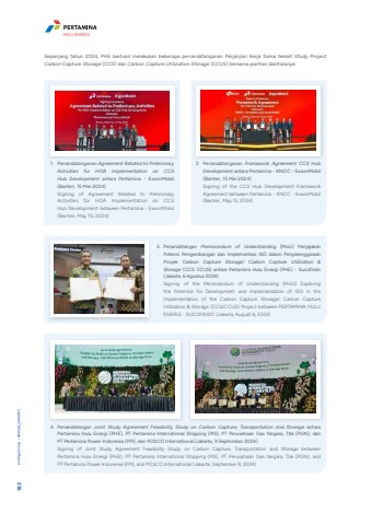 2. Penandatanganan Framework Agreement CCS Hub Development antara Pertamina - KNOC - ExxonMobil (Banten, 15 Mei 2024)Signing of the CCS Hub Development Framework Agreement between Pertamina - KNOC - ExxonMobil (Banten, May 15, 2024)3. Penandatangan Memorandum of Understanding (MoU) Penjajakan Potensi Pengembangan dan Implementasi ISO dalam Penyelenggaraan Proyek Carbon Capture Storage/ Carbon Capture Utilization & Storage (CCS CCUS) antara Pertamina Hulu Energi (PHE) - Sucofindo (Jakarta, 6 Agustus 2024)Signing of the Memorandum of Understanding (MoU) Exploring the Potential for Development and Implementation of ISO in the Implementation of the Carbon Capture Storage/ Carbon Capture Utilization & Storage (CCS/CCUS) Project between PERTAMINA HULU ENERGI - SUCOFINDO (Jakarta, August 6, 2024)1. Penandatanganan Agreement Related to Preliminary Activities for HOA Implementation on CCS Hub Development antara Pertamina - ExxonMobil (Banten, 15 Mei 2024)Signing of Agreement Related to Preliminary Activities for HOA Implementation on CCS Hub Development between Pertamina - ExxonMobil (Banten, May 15, 2024)4. Penandatangan Joint Study Agreement Feasibility Study on Carbon Capture, Transportation and Storage antara Pertamina Hulu Energi (PHE), PT Pertamina International Shipping (PIS), PT Perusahaan Gas Negara, Tbk (PGN), dan PT Pertamina Power Indonesia (PPI), dan POSCO International (Jakarta, 9 September 2024)Signing of Joint Study Agreement Feasibility Study on Carbon Capture, Transportation and Storage between Pertamina Hulu Energi (PHE), PT Pertamina International Shipping (PIS), PT Perusahaan Gas Negara, Tbk (PGN), and PT Pertamina Power Indonesia (PPI), and POSCO International (Jakarta, September 9, 2024)Sepanjang tahun 2024, PHE berhasil melakukan beberapa penandatanganan Perjanjian Kerja Sama terkait Study Project Carbon Capture Storage (CCS) dan Carbon Capture Utilization Storage (CCUS) bersama partner diantaranya:Laporan Tahunan %u2022 Annual Report 236HULU ENERGI