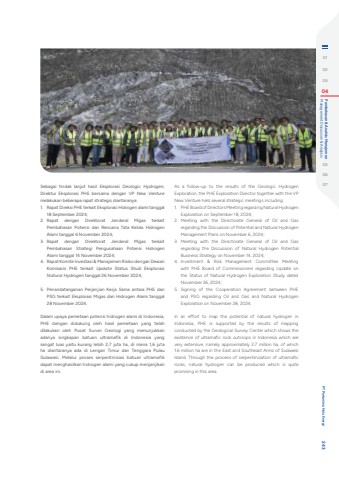 Sebagai tindak lanjut hasil Eksplorasi Geologic Hydrogen, Direktur Eksplorasi PHE bersama dengan VP New Venture melakukan beberapa rapat strategis diantaranya:1. Rapat Direksi PHE terkait Eksplorasi Hidrogen alami tanggal 18 September 2024;2. Rapat dengan Direktorat Jenderal Migas terkait Pembahasan Potensi dan Rencana Tata Kelola Hidrogen Alami tanggal 6 November 2024;3. Rapat dengan Direktorat Jenderal Migas terkait Pembahasan Strategi Pengusahaan Potensi Hidrogen Alami tanggal 14 November 2024;4. Rapat Komite Investasi & Manajemen Risiko dengan Dewan Komisaris PHE terkait Update Status Studi Eksplorasi Natural Hydrogen tanggal 26 November 2024;5. Penandatanganan Perjanjian Kerja Sama antara PHE dan PSG terkait Eksplorasi Migas dan Hidrogen Alami tanggal 28 November 2024.Dalam upaya pemetaan potensi hidrogen alami di Indonesia, PHE dengan didukung oleh hasil pemetaan yang telah dilakukan oleh Pusat Survei Geologi yang menunjukkan adanya singkapan batuan ultramafik di Indonesia yang sangat luas yaitu kurang lebih 2,7 juta ha, di mana 1,6 juta ha diantaranya ada di Lengan Timur dan Tenggara Pulau Sulawesi. Melalui proses serpentinisasi batuan ultramafik dapat menghasilkan hidrogen alami yang cukup menjanjikan di area ini.As a follow-up to the results of the Geologic Hydrogen Exploration, the PHE Exploration Director together with the VP New Venture held several strategic meetings including:1. PHE Board of Directors Meeting regarding Natural Hydrogen Exploration on September 18, 2024;2. Meeting with the Directorate General of Oil and Gas regarding the Discussion of Potential and Natural Hydrogen Management Plans on November 6, 2024;3. Meeting with the Directorate General of Oil and Gas regarding the Discussion of Natural Hydrogen Potential Business Strategy on November 14, 2024;4. Investment & Risk Management Committee Meeting with PHE Board of Commissioners regarding Update on the Status of Natural Hydrogen Exploration Study dated November 26, 2024;5. Signing of the Cooperation Agreement between PHE and PSG regarding Oil and Gas and Natural Hydrogen Exploration on November 28, 2024.In an effort to map the potential of natural hydrogen in Indonesia, PHE is supported by the results of mapping conducted by the Geological Survey Center which shows the existence of ultramafic rock outcrops in Indonesia which are very extensive, namely approximately 2.7 million ha, of which 1.6 million ha are in the East and Southeast Arms of Sulawesi Island. Through the process of serpentinization of ultramafic rocks, natural hydrogen can be produced which is quite promising in this area.010203 04 Management Discussion & Analysis Pembahasan & Analisis Manajemen050607 PT Pertamina Hulu Energi 243