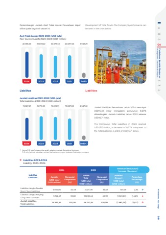 Aset Tidak Lancar 2020-2024 (USD-juta)Non-Current Assets 2020-2024 (USD-million)22.398,63 21.009,22 20.073,53 20.097,06 3.949,292024 2023 2022 2021 2020Jumlah Liabilitas Perusahaan tahun 2024 mencapai USD15,33 miliar mengalami penurunan 8,27% dibandingkan Jumlah Liabilitas tahun 2023 sebesar USD16,71 miliar.The Company's Total Liabilities in 2024 reached USD15.33 billion, a decrease of 8.27% compared to the Total Liabilities in 2023 of USD16.71 billion.Liabilitas LiabilitiesJumlah Liabilitas 2020-2024 (USD-juta)Total Liabilities 2020-2024 (USD-million)15.327,61 16.710,35 16.323,51 15.087,00 2.547,632024 2023 2022 2021 2020*)*) Hanya PHE saja (tanpa entitas anak), sebelum menjadi Subholding Upstream.PHE only (without subsidiary entities), before becoming an Upstream Subholding company.Liabilitas 2023-2024Liability 2023-2024LiabilitasLiabilities2024 2023 Kenaikan (Penurunan)Increase (Decrease)Jumlah(USD-juta)(USD-million)KomposisiComposition (%)JumlahTotal(USD-juta)(USD-million)KomposisiComposition (%)NominalAmount(USD-juta)(USD-million)PersentasePercentage(%)Liabilitas Jangka Pendek Short-Term Liabilities 6.159,00 40,18 6.017,91 36,01 141,09 2,34 %uf0e1Liabilitas Jangka Panjang Long-Term Liabilities 9.168,61 59,82 10.692,44 63,99 (1.523,83) (14,25) %uf0e2Jumlah LiabilitasTotal Liabilities 15.327,61 100,00 16.710,35 100,00 (1.382,74) (8,27) %uf0e2Development of Total Assets The Company's performance can be seen in the chart below.Perkembangan Jumlah Aset Tidak Lancar Perusahaan dapat dilihat pada bagan di bawah ini. 010203 04 Management Discussion & Analysis Pembahasan & Analisis Manajemen050607 PT Pertamina Hulu Energi 249