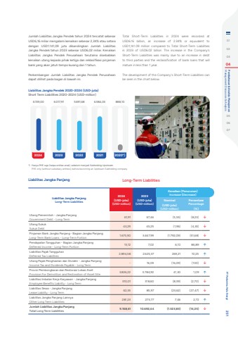 Jumlah Liabilitas Jangka Pendek tahun 2024 tercatat sebesar USD6,16 miliar mengalami kenaikan sebesar 2,34% atau setara dengan USD1.141,09 juta dibandingkan Jumlah Liabilitas Jangka Pendek tahun 2023 sebesar USD6,02 miliar. Kenaikan Liabilitas Jangka Pendek Perusahaan terutama disebabkan kenaikan utang kepada pihak ketiga dan reklasifikasi pinjaman bank yang akan jatuh tempo kurang dari 1 tahun.Perkembangan Jumlah Liabilitas Jangka Pendek Perusahaan dapat dilihat pada bagan di bawah ini.Total Short-Term Liabilities in 2024 were recorded at USD6.16 billion, an increase of 2.34% or equivalent to USD1,141.09 million compared to Total Short-Term Liabilities in 2023 of USD6.02 billion. The increase in the Company's Short-Term Liabilities was mainly due to an increase in debt to third parties and the reclassification of bank loans that will mature in less than 1 year.The development of the Company's Short-Term Liabilities can be seen in the chart below.Liabilitas Jangka Pendek 2020-2024 (USD-juta)Short Term Liabilities 2020-2024 (USD-million)6.159,00 6.017,91 5.691,68 6.584,03 888,102024 2023 2022 2021 2020*)*) Hanya PHE saja (tanpa entitas anak), sebelum menjadi Subholding Upstream.PHE only (without subsidiary entities), before becoming an Upstream Subholding company.Liabilitas Jangka Panjang Long-Term LiabilitiesLiabilitas Jangka PanjangLong-Term Liabilities2024(USD-juta)(USD-million)2023(USD-juta)(USD-million)Kenaikan (Penurunan)Increase (Decrease)Nominal(USD-juta)(USD-million)PersentasePercentage(%)Utang Pemerintah - Jangka PanjangGovernment Debt - Long Term 61,91 67,46 (5,55) (8,23) %uf0e2Utang SukukSukuk Debt 43,29 45,25 (1,96) (4,33) %uf0e2Pinjaman Bank Jangka Panjang - Bagian Jangka PanjangLong-Term Bank Loans - Long-Term Portion 1.675,90 3.467,99 (1.792,09) (51,68) %uf0e2Pendapatan Tangguhan - Bagian Jangka PanjangDeferred Income - Long-Term Portion 13,12 7,02 6,10 86,89 %uf0e1Liabilitas Pajak TangguhanDeferred Tax Liabilities 2.894,58 2.625,37 269,21 10,25 %uf0e1Utang Pajak Penghasilan dan Dividen - Jangka PanjangIncome Tax and Dividends Payable - Long Term - 16,09 (16,09) (100) %uf0e2Provisi Pembongkaran dan Restorasi Lokasi AsetProvision For Demolition and Restoration of Asset Site 3.826,22 3.784,92 41,30 1,09 %uf0e1Liabilitas Imbalan Kerja Karyawan - Jangka PanjangEmployee Benefits Liability - Long Term 310,01 318,60 (8,59) (2,70) %uf0e2Liabilitas Sewa - Jangka PanjangLease Liability - Long Term 62,35 85,97 (23,62) (27,47) %uf0e2Liabilitas Jangka Panjang LainnyaOther Long Term Liabilities 281,23 273,77 7,46 2,72 %uf0e1Jumlah Liabilitas Jangka PanjangTotal Long Term Liabilities 9.168,61 10.692,44 (1.523,83) (14,25) %uf0e2010203 04 Management Discussion & Analysis Pembahasan & Analisis Manajemen050607 PT Pertamina Hulu Energi 251