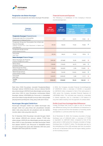 Pada tahun 2024 Perusahaan mencatat Penghasilan/Beban Keuangan sebesar USD202,35 juta, menurun sebesar 36,54% atau setara dengan USD116,53 juta dibandingkan periode yang sama tahun 2023 di mana Perusahaan membukukan Beban Keuangan sebesar USD318,88 juta. Penurunan ini disebabkan penurunan beban bunga dampak turunnya saldo utang jangka panjang karena pembayaran utang yang sudah jatuh tempo.Keuntungan (Kerugian) Selisih KursKeuntungan (Kerugian) Selisih Kurs adalah keuntungan atau kerugian selisih kurs yang timbul dari penyelesaian transaksi dalam mata uang asing dan dari penjabaran aset dan liabilitas moneter dalam mata uang selain dolar AS.Per 31 Desember 2024 Perusahaan mencatat Kerugian Selisih Kurs sebesar USD4,48 juta menurun sebesar 77,34% atau setara dengan USD15,29 juta dibandingkan periode yang sama tahun 2023 di mana Perusahaan mencatat Keuntungan Selisih Kurs sebesar USD19,77 juta. Penurunan ini disebabkan karena kurs USD menguat dari posisi akhir Desember 2023 dan posisi kewajiban lebih besar pada akun moneter.In 2024, the Company recorded Financial Income/Expenses of USD202.35 million, a decrease of 36.54% or equivalent to USD116.53 million compared to that of the same period in 2023 where the Company recorded Financial Expenses of USD318.88 million. This decrease was caused by a decrease in interest expenses, due to a decrease in the balance of long-term debts resulting from the payment of overdue debts.Profits (Loss) from Exchange Rate DifferencesForeign Exchange Gain (Loss) is a gain or loss on exchange rate differences arising from the settlement of transactions in foreign currencies and from the translation of monetary assets and liabilities in currencies other than the US dollar. As of December 31, 2024, the Company recorded a Foreign Exchange Loss of USD4.48 million, a decrease of 77.34% or equivalent to USD15.29 million compared to that of the same period in 2023 where the Company recorded a Foreign Exchange Gain of USD19.77 million. This decrease was due to the strengthening of the USD exchange rate from its position at the end of December 2023 and the higher liability position on the monetary account.DeskripsiDescription2024(USD-juta)(USD-million)2023(USD-juta)(USD-million)Kenaikan (Penurunan)Increase (Decrease)Nominal(USD-juta)(USD-million)PersentasePercentage(%)Penghasilan Keuangan/ Financial IncomePenyesuaian atas Porsi Lindung NilaiAdjustment of Hedging Portion - 0,17 (0,17) (100) %uf0e2Penghasilan Bunga dari Penempatan Kas di Bank dan Deposito BerjangkaInterest Income from Cash Placement in Banks and Time Deposits251,56 140,24 111,32 79,38 %uf0e1Penghasilan Bunga LainnyaOther Interest Income - - - - SubJumlahSub-Total 251,56 140,41 111,15 79,16 %uf0e1Beban Keuangan/ Finance ChargesBeban Keuangan dari PinjamanFinance Charge from Loans (297,33) (311,68) 14,35 (4,60) %uf0e2Beban AkresiAccretion Charge (119,93) (113,22) (6,71) 5,93 %uf0e1Beban Bunga dari SewaInterest Charge from Rent (17,22) (20,00) 2,78 (13,90) %uf0e2Beban Bunga LainnyaOther Interest Charge (19,43) (14,39) (5,04) 35,02 %uf0e1SubJumlahSub-Total (453,91) (459,29) 5,38 (1,17) %uf0e2Jumlah Total (202,35) (318,88) 116,53 (36,54) %uf0e2Penghasilan dan Beban KeuanganBerikut rincian penghasilan dan beban keuangan Perusahaan.Financial Income and ExpensesThe following is a breakdown of the Company's financial income and expenses.Laporan Tahunan %u2022 Annual Report 258HULU ENERGI