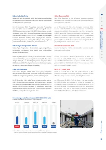 Beban Lain-lain NetoBeban Lain-lain Neto adalah selisih dari beban yang dihasilkan dari kegiatan non operasional, dikurangi dengan penghasilan dari kegiatan non operasional.Per 31 Desember 2024 Perusahaan mencatat Pendapatan Lain-lain Neto sebesar USD315,44 juta meningkat sebesar 379,76% atau setara dengan USD428,19 dibandingkan periode yang sama tahun 2023 di mana Perusahaan mencatat Beban Lain-lain Neto sebesar USD112,75 juta. Kenaikan ini disebabkan turunnya kontribusi BUMD, lebih tingginya laba asosiasi, pembalikan penyisihan piutang tak tertagih, dan pengakuan penalti keterlambatan pembayaran, dan klaim asuransi.Beban Pajak Penghasilan - BersihBeban Pajak Penghasilan - Bersih adalah pajak yang dihitung berdasarkan pendapatan kena pajak yang ditambahkan dengan pajak tangguhan.Beban Pajak Penghasilan - Bersih per 31 Desember 2024 tercatat sebesar USD1.771,54 juta, meningkat sebesar 0,28% atau setara dengan USD5,05 juta dibandingkan periode yang sama tahun 2023 sebesar USD1.766,49 juta. Kenaikan ini disebabkan sejalan dengan peningkatan pendapatan kena pajak.Laba Tahun BerjalanLaba Tahun Berjalan adalah laba bersih yang didapatkan Perusahaan atas Pendapatan Usaha PHE Subholding Upstream setelah dikurangi berbagai beban, termasuk beban pajak.Per 31 Desember 2024, Laba Tahun Berjalan tercatat sebesar USD3,12 miliar meningkat sebesar 14,51% atau setara dengan USD395,50 juta dibandingkan periode yang sama tahun 2023 sebesar USD2,73 miliar. Kenaikan ini disebabkan penurunan biaya depresiasi karena penyesuaian cadangan hasil sertifikasi D&M dan pendapatan keuangan lain - lain.Other Expenses NetNet Other Expenses is the difference between expenses generated from non-operational activities, minus income from non-operational activities.As of December 31, 2024, the Company recorded Other Income - Net of USD315.44 million, an increase of 379.76% or equivalent to USD428.19 compared to that of the same period in 2023 where the Company recorded Other Expenses - Net of USD112.75 million. This increase was due to a decrease in BUMD contributions, higher association profits, reversal of provisions for uncollected receivables, acknowledgment of late payment penalties, and insurance claims.Income Tax Expenses - NetIncome Tax Expense - Net is a tax calculated based on taxable income plus deferred tax.Income Tax Expenses - Net as of December 31, 2024 was recorded at USD1,771.54 million, an increase of 0.28% or equivalent to USD5.05 million compared to that of the same period in 2023 of USD1,766.49 million. This increase was in line with the increase in taxable income.Profit of Current YearProfit of Current Year is the net profit obtained by the Company from PHE Subholding Upstream's Business Income after deducting various expenses, including tax expenses.As of December 31, 2024, Profit of Current Year was recorded at USD3.12 billion, an increase of 14.51% or equivalent to USD395.50 million compared to the same period in 2023 of USD2.73 billion. This increase was due to a decrease in depreciation costs due to adjustments to reserves resulting from D&M certification and other financial incomes.Perkembangan Laba Tahun Berjalan 2020-2024 (USD-juta)Current Year Profit 2020-2024 (USD-million)3.121,03 2.725,54 4.674,16 2.952,64 223,96 2024 2023 2022 2021 2020*)*) Hanya PHE saja (tanpa entitas anak), sebelum menjadi Subholding Upstream.PHE only (without subsidiary entities), before becoming an Upstream Subholding company.010203 04 Management Discussion & Analysis Pembahasan & Analisis Manajemen050607 PT Pertamina Hulu Energi 259