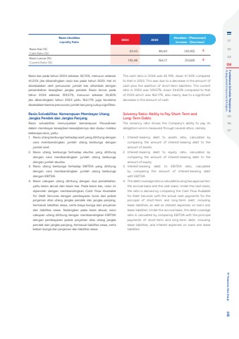 Rasio kas pada tahun 2024 sebesar 42,15%, menurun sebesar 41,25% jika dibandingkan rasio kas pada tahun 2023. Hal ini disesbabkan oleh penurunan jumlah kas ditambah dengan penambahan kewajiban jangka pendek. Rasio lancar pada tahun 2024 sebesar 129,57%, menurun sebesar 34,60% jika dibandingkan tahun 2023 yaitu 164,17% juga terutama disebabkan karena penurunan jumlah kas yang cukup signifikan.Rasio Solvabilitas: Kemampuan Membayar Utang Jangka Pendek dan Jangka PanjangRasio solvabilitas menunjukkan kemampuan Perusahaan dalam membayar kewajiban-kewajibannya dan diukur melalui beberapa rasio, yaitu:1. Rasio utang berbunga terhadap aset yang dihitung dengan cara membandingkan jumlah utang berbunga dengan jumlah aset.2. Rasio utang berbunga terhadap ekuitas yang dihitung dengan cara membandingkan jumlah utang berbunga dengan jumlah ekuitas.3. Rasio utang berbunga terhadap EBITDA yang dihitung dengan cara membandingkan jumlah utang berbunga dengan EBITDA.4. Rasio cakupan utang dihitung dengan dua pendekatan, yaitu basis akrual dan basis kas. Pada basis kas, rasio ini diperoleh dengan membandingkan Cash Flow Available for Debt Services dengan pembayaran tunai dari pokok pinjaman atas utang jangka pendek dan jangka panjang, termasuk liabilitas sewa, serta biaya bunga dari pinjaman dan liabilitas sewa. Sedangkan pada basis akrual, rasio cakupan utang dihitung dengan membandingkan EBITDA dengan pembayaran pokok pinjaman atas utang jangka pendek dan jangka panjang, termasuk liabilitas sewa, serta beban bunga dari pinjaman dan liabilitas sewa.The cash ratio in 2024 was 42.15%, down 41.25% compared to that in 2023. This was due to a decrease in the amount of cash plus the addition of short-term liabilities. The current ratio in 2024 was 129.57%, down 34.60% compared to that of 2023 which was 164.17%, also mainly due to a significant decrease in the amount of cash.Solvency Ratio: Ability to Pay Short-Term and Long-Term DebtsThe solvency ratio shows the Company's ability to pay its obligations and is measured through several ratios, namely:1. Interest-bearing debt to assets ratio, calculated by comparing the amount of interest-bearing debt to the amount of assets.2. Interest-bearing debt to equity ratio, calculated by comparing the amount of interest-bearing debt to the amount of equity.3. Interest-bearing debt to EBITDA ratio, calculated by comparing the amount of interest-bearing debt with EBITDA.4. The debt coverage ratio is calculated using two approaches: the accrual basis and the cash basis. Under the cash basis, the ratio is derived by comparing the Cash Flow Available for Debt Services with the actual cash payments for the principal of short-term and long-term debt, including lease liabilities, as well as interest expenses on loans and lease liabilities. Under the accrual basis, the debt coverage ratio is calculated by comparing EBITDA with the principal payments of short-term and long-term debt, including lease liabilities, and interest expenses on loans and lease liabilities.Rasio LikuiditasLiquidity Ratio 2024 2023 Kenaikan - (Penurunan)Increase - (Decrease)Rasio Kas (%)Cash Ratio (%) 42,45 83,40 (40,95) %uf0e2Rasio Lancar (%)Current Ratio (%) 130,48 164,17 (33,69) %uf0e2010203 04 Management Discussion & Analysis Pembahasan & Analisis Manajemen050607 PT Pertamina Hulu Energi 265
