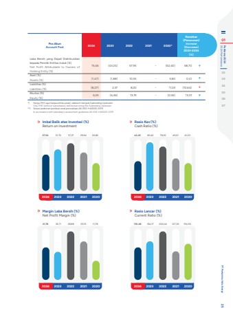 *) Hanya PHE saja (tanpa entitas anak), sebelum menjadi Subholding UpstreamOnly PHE (without subsidiaries), before becoming the Subholding Upstream**) Sesuai pedoman penilaian anak perusahaan A6-002-H40000-2019In accordance with subsidiary%u2019s assessment guidelines A6-002-H40000-2019Pos AkunAccount Post 2024 2023 2022 2021 2020*Kenaikan (Penurunan)Increase (Decrease)2023-2024(%)Laba Bersih yang Dapat Diatribusikan kepada Pemilik Entitas Induk (%)Net Profit Attributable to Owners of Holding Entity (%)15,46 (43,24) 57,95 - (62,40) 58,70 %uf0e1Aset (%)Assets (%) (1,47) (1,88) 10,55 - 3,80 0,41 %uf0e1Liabilitas (%)Liabilities (%) (8,27) 2,37 8,20 - 11,03 (10,64) %uf0e2Ekuitas (%)Equity (%) 6,55 (6,46) 13,19 - (2,06) 13,01 %uf0e127,94 31,70 37,27 29,94 20,822024 2023 2022 2021 2020Imbal Balik atas Investasi (%)Return on Investment42,45 83,40 78,30 49,01 41,032024 2023 2022 2021 2020Rasio Kas (%)Cash Ratio (%)21,78 18,71 28,88 25,15 11,782024 2023 2022 2021 2020Margin Laba Bersih (%)Net Profit Margin (%)130,48 164,17 200,44 127,30 154,502024 2023 2022 2021 2020Rasio Lancar (%)Current Ratio (%)01 2024 Performance Performa 2024020304050607Laporan Tahunan %u2022 Annual Report 24PT Pertamina Hulu Energi 25