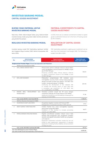 INVESTASI BARANG MODALCAPITAL GOODS INVESTMENTIKATAN YANG MATERIAL UNTUK INVESTASI BARANG MODALPada tahun 2024, tidak terdapat ikatan yang material terkait investasi barang modal yang bukan dalam bentuk pendanaan yang dimiliki Perusahaan.REALISASI INVESTASI BARANG MODALInvestasi barang modal PHE Subholding Upstream terlihat dari Anggaran Biaya Investasi (ABI). Berikut disampaikan ABI tahun 2024.MATERIAL COMMITMENTS TO CAPITAL GOODS INVESTMENT In 2024, there are no material commitments related to capital goods investments that are not in the form of funding owned by the Company.REALIZATION OF CAPITAL GOODS INVESTMENTPHE Subholding Upstream%u2019s capital goods investment can be seen from the Investment Cost Budget (ABI). The following is evident from ABI in 2024.No. Jenis InvestasiTypes of InvestmentTujuan investasiInvestment ObjectivesNilai (USD-juta)Value (USD-million)Eksplorasi dan Produksi Migas/ Oil and Gas Exploration and ProductionABI Business Development (BD)1 OPLL SANGA SANGA FASE 2 Memproduksi potensi cadangan reservoir interval dalam untuk mendapatkan volume produksi 9.4 MMBBL minyak dan 157 BCF WH gas.Producing potential deep interval reservoir reserves to obtain a production volume of 9.4 MMBBL oil and 157 BCF WH gas.324,512 OPLL WK MAHAKAM Melanjutkan pengembangan WK mahakam guna meningkatkan recovery factor masing-masing lapangan dengan kumulatif produksi gas sebesar ~270 BSCF danminyak + kondensat sebesar ~9 MMBBL.Continuing the development of the mahakam WK to increase the recovery factor of each field with a cumulative gas production of ~270 BSCF and oil + condensate of ~9 MMBBL.207,783 ROKAN WELL DEVELOPMENT SLO PETANI FASE 1Tambahan produksi minyak dari 46 sumur dengan menambah cadangan 2P minyak sebesar 12,02 MMBO.Additional oil production from 46 wells by increasing 2P oil reserves of 12.02 MMBO.111,36Sub Jumlah ABI BD / Sub Total ABI BD 3.335,72ABI Non-Business Development (NBD)1 INVESTASI DI ASET LAIN (PIEP) Pengelolaan kegiatan investasi di AP terbuka PIEP.Management of investment activities in PIEP open AP. 97.122 WEST QURNA 1 NEW FASILITIES Instalasi Fasilitas baru untuk meningkatkan kapasitas pemrosesan hingga 800 KBPD.Installation of new facilities to increase processing capacity up to 800 KBPD.66,773 PEMELIHARAAN FASILITAS ROKAN Kegiatan pemeliharaan peralatan meliputi namun tidak terbatas pada penggantian pipa, penggantian peralatan obsolete, peningkatan kehandalan fasilitas dan pengadaan unit ready line.Equipment maintenance activities include but are not limited to pipe replacement, replacement of obsolete equipment, increasing facility reliability and procurement of ready line units.33,72Sub Jumlah ABI NBD/ SubTotal ABI NBD 721,73Sub Total ABI Eksplorasi dan Produksi MigasSub Total of ABI Oil and Gas Exploration and Production 4.057,45Laporan Tahunan %u2022 Annual Report 268HULU ENERGI