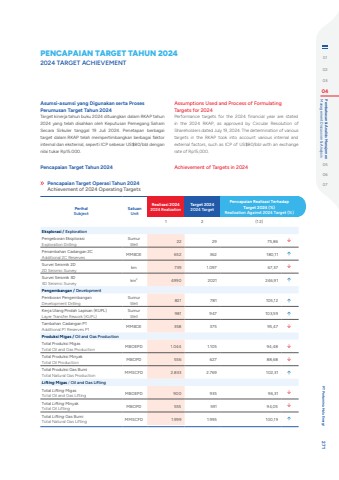 PENCAPAIAN TARGET TAHUN 20242024 TARGET ACHIEVEMENTAsumsi-asumsi yang Digunakan serta Proses Perumusan Target Tahun 2024Target kinerja tahun buku 2024 dituangkan dalam RKAP tahun 2024 yang telah disahkan oleh Keputusan Pemegang Saham Secara Sirkuler tanggal 19 Juli 2024. Penetapan berbagai target dalam RKAP telah mempertimbangkan berbagai faktor internal dan eksternal, seperti ICP sebesar US$80/bbl dengan nilai tukar Rp15.000.Assumptions Used and Process of Formulating Targets for 2024Performance targets for the 2024 financial year are stated in the 2024 RKAP, as approved by Circular Resolution of Shareholders dated July 19, 2024. The determination of various targets in the RKAP took into account various internal and external factors, such as ICP of US$80/bbl with an exchange rate of Rp15,000.Pencapaian Target Operasi Tahun 2024Achievement of 2024 Operating TargetsPerihalSubjectSatuanUnitRealisasi 20242024 RealizationTarget 20242024 TargetPencapaian Realisasi Terhadap Target 2024 (%)Realization Against 2024 Target (%)1 2 (1:2)Eksplorasi / ExplorationPengeboran EksplorasiExploration DrillingSumurWell 22 29 75,86 %uf0e2Penambahan Cadangan 2CAdditional 2C Reserves MMBOE 652 362 180,11 %uf0e1Survei Seismik 2D2D Seismic Survey km 739 1.097 67,37 %uf0e2Survei Seismik 3D3D Seismic Survey km2 4990 2021 246,91 %uf0e1Pengembangan / DevelopmentPemboran PengembanganDevelopment DrillingSumurWell 821 781 105,12 %uf0e1Kerja Ulang Pindah Lapisan (KUPL)Layer Transfer Rework (KUPL)SumurWell 981 947 103,59 %uf0e1Tambahan Cadangan P1Additional P1 Reserves P1 MMBOE 358 375 95,47 %uf0e2Produksi Migas / Oil and Gas ProductionTotal Produksi MigasTotal Oil and Gas Production MBOEPD 1.044 1.105 94,48 %uf0e2Total Produksi MinyakTotal Oil Production MBOPD 556 627 88,68 %uf0e2Total Produksi Gas BumiTotal Natural Gas Production MMSCFD 2.833 2.769 102,31 %uf0e1Lifting Migas / Oil and Gas LiftingTotal Lifting MigasTotal Oil and Gas Lifting MBOEPD 900 935 96,31 %uf0e2Total Lifting MinyakTotal Oil Lifting MBOPD 555 591 94,05 %uf0e2Total Lifting Gas BumiTotal Natural Gas Lifting MMSCFD 1.999 1.995 100,19 %uf0e1Pencapaian Target Tahun 2024 Achievement of Targets in 2024010203 04 Management Discussion & Analysis Pembahasan & Analisis Manajemen050607 PT Pertamina Hulu Energi 271