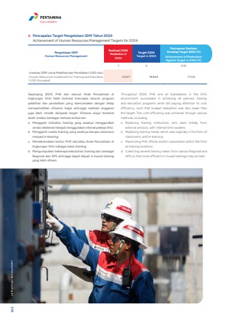Pencapaian Target Pengelolaan SDM Tahun 2024Achievement of Human Resources Management Targets for 2024Pengelolaan SDMHuman Resources ManagementRealisasi 2024Realization in 2024Target 2024Target in 2024Pencapaian Realisasi Terhadap Target 2024 (%)Achievement of Realization Against Target in 2024 (%)1 2 (1:2)Investasi SDM untuk Pelatihan dan Pendidikan (USD-ribu)Human Resources Investment for Training and Education (USD-thousand)14.617 18.849 77,5%Sepanjang 2024, PHE dan seluruh Anak Perusahaan di lingkungan SHU telah berhasil mencapai seluruh program pelatihan dan pendidikan yang direncanakan dengan tetap memperhatikan efisiensi biaya sehingga realisasi anggaran juga lebih rendah daripada target. Efisiensi biaya tersebut diraih melalui berbagai metode antara lain:a. Mengganti instruktur training yang awalnya menggunakan vendor eksternal menjadi menggunakan internal pekerja SHU.b. Mengganti media training yang awalnya berupa classroom menjadi e-learning.c. Memaksimalkan kantor PHE dan/atau Anak Perusahaan di lingkungan SHU sebagai lokasi training.d. Mengumpulkan beberapa kebutuhan training dari berbagai Regional dan APS sehingga dapat dibuat in-house trainingyang lebih efisien.Throughout 2024, PHE and all Subsidiaries in the SHU environment succeeded in achieving all planned training and education programs while still paying attention to cost efficiency, such that budget realization was also lower than the target. This cost efficiency was achieved through various methods, including:a. Replacing training instructors, who were initially from external vendors, with internal SHU workers.b. Replacing training media, which was originally in the form of classrooms, with e-learning.c. Maximizing PHE offices and/or subsidiaries within the SHU as training locations.d. Collecting several training needs from various Regional and APS so that more efficient in-house trainings may be held.Laporan Tahunan %u2022 Annual Report 274HULU ENERGI
