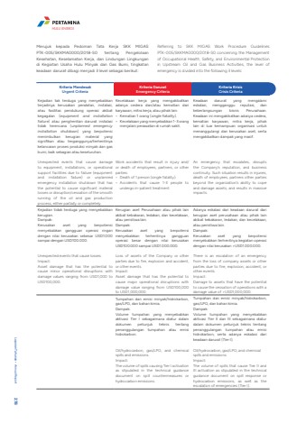 Kriteria MendesakUrgent CriteriaKriteria DaruratEmergency CriteriaKriteria KrisisCrisis CriteriaKejadian tak terduga yang menyebabkan terjadinya kerusakan peralatan, instalasi, atau fasilitas pendukung operasi akibat kegagalan (equipment and installation failure) atau penghentian darurat instalasi tidak terencana (unplanned emergency installation shutdown) yang berpotensi menimbulkan kerugian material yang signifikan atau terganggunya/terhentinya kelancaran proses produksi minyak dan gas bumi, baik sebagian atau keseluruhan.Unexpected events that cause damage to equipment, installations, or operational support facilities due to failure (equipment and installation failure) or unplanned emergency installation shutdown that has the potential to cause significant material losses or disruption/cessation of the smooth running of the oil and gas production process, either partially or completely.Kecelakaan kerja yang mengakibatkan adanya cedera dan/atau kematian dari karyawan, mitra kerja, atau pihak lain:%u2022 Kematian 1 orang (single fatality).%u2022 Kecelakaan yang menyebabkan 1-3 orang menjalani perawatan di rumah sakit.Work accidents that result in injury and/or death of employees, partners, or other parties:%u2022 Death of 1 person (single fatality).%u2022 Accidents that cause 1-3 people to undergo in-patient treatment.Keadaan darurat yang mengalami eskalasi, mengganggu reputasi, dan keberlangsungan bisnis Perusahaan. Keadaan ini mengakibatkan adanya cedera, kematian karyawan, mitra kerja, pihak lain di luar kemampuan organisasi untuk menanggulangi dan kerusakan aset, serta mengakibatkan dampak yang masif.An emergency that escalates, disrupts the Company%u2019s reputation, and business continuity. Such situation results in injuries, death of employees, partners other parties beyond the organization%u2019s ability to cope and damage assets, and results in massive impacts.Kejadian tidak terduga yang menyebabkan kerugian.Dampak:Kerusakan aset yang berpotensi menyebabkan gangguan operasi ringan dengan nilai kerusakan sebesar USD1.000 sampai dengan USD100.000.Unexpected events that cause losses. Impact: Asset damage that has the potential to cause minor operational disruptions with damage values ranging from USD1,000 to USD100,000.Kerugian aset Perusahaan atau pihak lain akibat kebakaran, ledakan, dan kecelakaan, atau peristiwa lain.Dampak:Kerusakan aset yang berpotensi menyebabkan terhentinya gangguan operasi besar dengan nilai kerusakan USD100.000 sampai USD1.000.000.Loss of assets of the Company or other parties due to fire, explosion and accident, or other events.Impact:Asset damage that has the potential to cause major operational disruptions with damage value ranging from USD100,000 to USD1,000,000.Adanya eskalasi dari keadaan darurat dari kerugian aset perusahaan atau pihak lain akibat kebakaran, ledakan, dan kecelakaan, atau peristiwa lain.Dampak:Kerusakan aset yang berpotensi menyebabkan terhentinya kegiatan operasi dengan nilai kerusakan >USD1.000.000.There is an escalation of an emergency from the loss of company assets or other parties due to fire, explosion, accident, or other events.Impact:Damage to assets that have the potential to cause the cessation of operations with a damage value of >USD1,000,000.Tumpahan dan emisi minyak/hidrokarbon, gas/LPG, dan bahan kimia.Dampak:Volume tumpahan yang menyebabkan aktivasi Tier I sebagaimana diatur dalam dokumen petunjuk teknis tentang penanggulangan tumpahan atau emisi hidrokarbon.Oil/hydrocarbon, gas/LPG, and chemical spills and emissions.Impact:The volume of spills causing Tier I activation as stipulated in the technical guidance document on spill countermeasures or hydrocarbon emissions.Tumpahan dan emisi minyak/hidrokarbon, gas/LPG, dan bahan kimia.Dampak:Volume tumpahan yang menyebabkan aktivasi Tier II dan III sebagaimana diatur dalam dokumen petunjuk teknis tentang penanggulangan tumpahan atau emisi hidrokarbon, serta adanya eskalasi dari keadaan darurat (Tier I).Oil/hydrocarbon, gas/LPG, and chemicalspills and emissions.Impact:The volume of spills that cause Tier II and III activation as stipulated in the technical guidance document on spill response or hydrocarbon emissions, as well as the escalation of emergencies (Tier I).Merujuk kepada Pedoman Tata Kerja SKK MIGAS PTK-005/SKKMA0000/2018-S0 tentang Pengelolaan Kesehatan, Keselamatan Kerja, dan Lindungan Lingkungan di Kegiatan Usaha Hulu Minyak dan Gas Bumi, tingkatan keadaan darurat dibagi menjadi 3 level sebagai berikut:Referring to SKK MIGAS Work Procedure Guidelines PTK-005/SKKMA0000/2018-S0 concerning the Management of Occupational Health, Safety, and Environmental Protection in Upstream Oil and Gas Business Activities, the level of emergency is divided into the following 3 levels:Laporan Tahunan %u2022 Annual Report 278HULU ENERGI