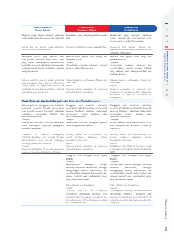 Kriteria MendesakUrgent CriteriaKriteria DaruratEmergency CriteriaKriteria KrisisCrisis CriteriaKejadian yang dapat menjadi perhatian media (lokal, nasional, maupun internasional).Events that can attract media attention (local, national, or international).Kecelakaan yang menjadi perhatian media lokal.Accidents that attract local media attention.Kecelakaan yang menjadi perhatian media nasional dan internasional, serta memengaruhi reputasi Perusahaan.Accidents that attract national and international media attention and affect the Company's reputation.Perubahan cuaca yang ekstrim dan/atau potensi bencana alam, kabut asap yang dapat memengaruhi keselamatan, kesehatan personil, dan/atau kelangsungan kegiatan operasi tanpa melakukan evakuasi sebagian personil.Extreme weather changes and/or potential natural disasters, haze that can affect the safety, health of personnel, and/or the continuity of operational activities without evacuating some personnel.Bencana alam, gempa bumi, banjir, dan kebakaran hutan.Dampak:Memerlukan evakuasi sebagian personil tanpa menghentikan operasi.Natural disasters, earthquakes, floods, and forest fires.Impact: Requires partial evacuation of personnel without stopping operations.Bencana alam, gempa bumi, banjir, dan kebakaran hutan.Dampak:Memerlukan evakuasi personil dan menghentikan operasi dengan eskalasi yang meluas, serta adanya eskalasi dari keadaan darurat.Natural disasters, earthquakes, floods, and forest fires. Impact: Requires evacuation of personnel and shutdown of operations with widespread escalation, as well as escalation of emergency.Wabah (Outbreak) atau Kondisi Darurat Medis/ Outbreak or Medical EmergencyAdanya potensi gangguan dan ancaman keamanan (security threat), demonstrasi (civil unrest), sandera (hostage), sabotase (sabotage), pemogokan (strike), dan terorisme (terrorism).Dampak:Memerlukan mobilisasi bantuan keamanan untuk mencegah terjadinya gangguan/ancaman keamanan.Outbreak or Medical Emergency Potential disruption and security threats, demonstrations (civil unrest), hostages, sabotage, strikes, and terrorism. Impact: Requires mobilization of security assistance to prevent security disturbances/threats.Gangguan dan ancaman keamanan (security threat), demonstrasi (civil unrest), sandera (hostage), sabotase (sabotage), pemogokan (strike), blokade, atau terorisme (terrorism).Dampak:Memerlukan evakuasi sebagian personil tanpa menghentikan operasi.Security threats and disturbances, civil unrest, hostages, sabotage, strikes, blockades, or terrorism.Impact:Requires partial evacuation of personnel without stopping operations.Gangguan dan ancaman keamanan (security threat), demonstrasi (civil unrest), sandera (hostage), sabotase (sabotage), pemogokan (strike), blokade, atau terorisme (terrorism).Dampak:Adanya eskalasi dari Keadaan Darurat dan/atau mengaktifkan Business Continuity Plan (BCP).Security threats and disturbances, civil unrest, hostages, sabotage, strikes, blockades, or terrorism.Impact:Escalation of the State of Emergency and/or activation of the Business Continuity Plan (BCP).Gangguan dan serangan siber (cyber attack).Dampak:Melumpuhkan sebagian jaringan teknologi informasi Perusahaan, sehingga mengganggu operasi Perusahaan dan menghilangkan sebagian data penting dan rahasia (critical and confidential data) yang dimiliki Perusahaan.Cyber attacks and disruptions.Impact:Disabling part of the Company's information technology network, thus disrupting the Company's operations and eliminating some of the Company's critical and confidential data.Gangguan dan serangan siber (cyber attack).Dampak:Melumpuhkan seluruh jaringan teknologi informasi Perusahaan, sehingga mengganggu operasi Perusahaan dan menghilangkan seluruh data penting dan rahasia (critical and confidential data) yang dimiliki Perusahaan.Cyber attacks and disruptions.Impact:Disabling the Company's entire information technology network, disrupting the Company's operations and eliminating all critical and confidential data owned by the Company.010203 04 Management Discussion & Analysis Pembahasan & Analisis Manajemen050607 PT Pertamina Hulu Energi 279