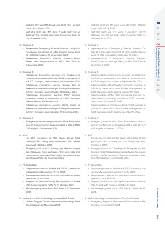 %u2022 Wet Drill SERT dan IMT Zona 6 serta SERT PDC - Oil Spill Case - 6 - 8 Maret 2024. %u2022 Wet Drill SERT dan IMT Zona 7 serta SERT RU VI Balongan_Fire, Oil Spill dan Medic Emergency Case_13 - 14 November 2024. 3. Regional 3: %u2022 Pelaksanaan Emergency Exercise Scenario Oil Spill di Pengapalan Kondensat di Jetty Dolphin Bunyu Zona 10-JOB Simenggaris, 25 September 2024. %u2022 Pelaksanaan Emergency Exercise Scenario Bomb Threat dan Penyanderaan di BBO Site Zona 8, 9 Desember 2024. 4. Regional 4: %u2022 Pelaksanaan Emergency Exercise Fire Readiness di Perkantoran berkolaborasi dengan Building Management di PJOT, Kuningan, Jakarta Selatan, 26 September 2024 %u2022 Pelaksanaan Emergency Exercise Gempa Bumi di Perkantoran berkolaborasi dengan Building Management di PJOT, Kuningan, Jakarta Selatan, 10 Oktober 2024. %u2022 Pelaksanaan Emergency Exercise MCIP skenario keracunan massal di perkantoran di PJOT, Kuningan, Jakarta Selatan, 31 Oktober 2024. %u2022 Pelaksanaan Emergency Exercise Bomb Threat di Perkantoran berkolaborasi dengan Building Management di PJOT, Kuningan, Jakarta Selatan, 19 Desember 2024. 5. Regional 5: %u2022 Emergency exercise dengan skenario %u201cFlash Fire%u201d karena Loss of Containment in Degassing Boot V-222, di MLN CPF, Algeria, 12 November 2024. 6. PDSI: %u2022 Fire Drill Emergency di PDC Tower dengan total partisipan 232 orang serta melibatkan Tim Damkar Setempat, 3 Oktober 2024. %u2022 Emergency Drill di MCC Building dgn Skenario Gempa dan Kebakaran, Total partisipan PDSI yang hadir 252 orang dengan melibatkan Tim Damkar serta regu darurat dari Gedung MCC, 28 November 2024. 7. PT Badak NGL: %u2022 Unignited gas leak on Pipeline KM 55.100, melibatkan masyarakat sekitar pipeline, 16 Mei 2024. %u2022 Fire emergency exercise at loading dock I during loading operation, 25 Juni 2024. %u2022 Engine Cowl Detached During Final Approach to Badak LNG Airport, bersama Pelita Air, 17 Oktober 2024 %u2022 Fire emergency exercise di 3E-7 Train E, 17 Desember 2024. 8. Kantor Pusat PHE Subholding Upstream (PHE Tower): %u2022 Latihan Tanggap Darurat dengan skenario Gempa Bumi dan Kebakaran, 22 November 2024.%u2022 Wet Drill SERT and IMT Zone 6 and SERT PDC - Oil Spill Case - March 6 - 8, 2024.%u2022 Wet Drill SERT and IMT Zone 7 and SERT RU VI Balongan_Fire, Oil Spill and Medic Emergency Case_13 - November 14, 2024.3. Regional 3:%u2022 Implementation of Emergency Exercise Scenario Oil Spill at Condensate Shipment at Jetty Dolphin Bunyu Zone 10-JOB Simenggaris, September 25, 2024.%u2022 Implementation of Emergency Exercise Scenario Bomb Threat and Hostage Taking at BBO Site Zone 8, December 9, 2024.4. Regional 4:%u2022 Implementation of Emergency Exercise Fire Readiness in Offices in collaboration with Building Management at PJOT, Kuningan, South Jakarta, September 26, 2024.%u2022 Implementation of Earthquake Emergency Exercise in Offices in collaboration with Building Management at PJOT, Kuningan, South Jakarta, October 10, 2024.%u2022 Implementation of the MCIP Emergency Exercise for mass poisoning scenarios in offices at PJOT, Kuningan, South Jakarta, October 31, 2024.%u2022 Implementation of Emergency Bomb Threat Exercise in Offices in collaboration with Building Management at PJOT, Kuningan, South Jakarta, December 19, 2024.5. Regional 5:%u2022 Emergency exercise with %u201cFlash Fire%u201d scenario due to Loss of Containment in Degassing Boot V-222, at MLN CPF, Algeria, November 12, 2024.6. PDSI:%u2022 Emergency Fire Drill at PDC Tower with a total of 232 participants and involving the local firefighting team, October 3, 2024.%u2022 Emergency Drill at MCC Building with Earthquake and Fire Scenario, Total PDSI participants present were 252 people involving the Fire Department Team and emergency team from MCC Building, November 28, 2024.7. PT Badak NGL:%u2022 Unignited gas leak on Pipeline KM 55.100, involving the community around the pipeline, May 16, 2024.%u2022 Fire emergency exercise at loading dock I during loading operation, June 25, 2024.%u2022 Engine Cowl Detached During Final Approach to Badak LNG Airport, with Pelita Air, October 17, 2024.%u2022 Fire emergency exercise at 3E-7 Train E, December 17, 2024.8. PHE Subholding Upstream Head Office (PHE Tower):%u2022 Emergency Response Exercise with Earthquake and Fire Scenario, November 22, 2024.010203 04 Management Discussion & Analysis Pembahasan & Analisis Manajemen050607 PT Pertamina Hulu Energi 281