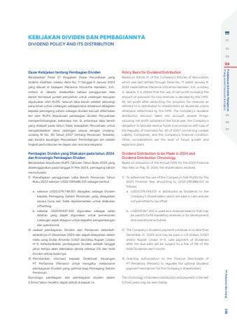 KEBIJAKAN DIVIDEN DAN PEMBAGIANNYADIVIDEND POLICY AND ITS DISTRIBUTIONDasar Kebijakan tentang Pembagian DividenBerdasarkan Pasal 21 Anggaran Dasar Perusahaan yang terakhir disahkan melalui Akta No. 11 tanggal 9 Januari 2024 yang dibuat di hadapan Marianne Vincentia Hamdani, S.H., notaris di Jakarta, disebutkan bahwa penggunaan laba bersih termasuk jumlah penyisihan untuk cadangan kerugian diputuskan oleh RUPS. Seluruh laba bersih setelah dikurangi penyisihan untuk cadangan sebagaimana dimaksud dibagikan kepada pemegang saham sebagai dividen kecuali ditentukan lain oleh RUPS. Keputusan pembagian dividen Perusahaan mempertimbangkan beberapa hal, di antaranya laba bersih yang didapat pada tahun fiskal, kewajiban Perusahaan untuk mengalokasikan dana cadangan sesuai dengan Undangundang RI No. 40 Tahun 2007 tentang Perseroan Terbatas, dan kondisi keuangan Perusahaan. Pertimbangan lain adalah tingkat pertumbuhan ke depan dan rencana ekspansi.Pembagian Dividen yang Dilakukan pada tahun 2024 dan Kronologis Pembagian DividenBerdasarkan keputusan RUPS Tahunan Tahun Buku 2023 yang diselenggarakan pada tanggal 31 Mei 2024, pemegang saham memutuskan:1) Menetapkan penggunaan Laba Bersih Perseroan Tahun Buku 2023 sebesar USD2.599.686.501 sebagai berikut: a. sebesar USD2.079.749.201 dibagikan sebagai Dividen kepada Pemegang Saham Perseroan yang dibayarkan secara tunai dan tidak diperkenankan untuk dilakukan offsetting. b. sebesar USD519.937.300 digunakan sebagai saldo ditahan yang dapat digunakan untuk pemenuhan cadangan wajib ataupun untuk kegiatan pengembangan dan operasional.2) Jadwal pembayaran Dividen dari Perseroan selambatlambatnya 31 Desember 2024 dan dapat dibayarkan dalam mata uang Dollar Amerika (USD) dan/atau Rupiah (Jisdor H-1). Keterlambatan pembayaran Dividen setelah tanggal jatuh tempo akan dikenakan denda sebesar 2% dari total Dividen setiap bulannya. 3) Memberikan otorisasi kepada Direktorat Keuangan PT Pertamina (Persero) untuk mengatur mekanisme pembayaran Dividen yang optimal bagi Pemegang Saham Perseroan.Kronologis pembagian dan pembayaran dividen dalam 5 (lima) tahun terakhir dapat dilihat di bawah ini.Policy Basis for Dividend DistributionBased on Article 21 of the Company's Articles of Association which was last ratified through Deed No. 11 dated January 9, 2024 made before Marianne Vincentia Hamdani, S.H., a notary in Jakarta, it is stated that the use of net profit including the amount of provision for loss reserves is decided by the GMS. All net profit after deducting the provision for reserves as referred to is distributed to shareholders as dividends unless otherwise determined by the GMS. The Company's dividend distribution decision takes into account several things, including net profit obtained in the fiscal year, the Company's obligation to allocate reserve funds in accordance with Law of the Republic of Indonesia No. 40 of 2007 concerning Limited Liability Companies, and the Company's financial condition. Other considerations are the level of future growth and expansion plans.Dividend Distribution to be Made in 2024 and Dividend Distribution ChronologyBased on resolution of the Annual GMS for the 2023 Financial Year held on May 31, 2024, the shareholders resolved:1) To determine the use of the Company's Net Profits for the 2023 Financial Year amounting to USD2,599,686,501 as follows:a. USD2,079,749,201 is distributed as Dividends to the Company's Shareholders which are paid in cash and are not permitted to be offset.b. USD519,937,300 is used as a retained balance that may be used to fulfill mandatory reserves or for development and operational activities.2) The Company's Dividend payment schedule is no later than December 31, 2024 and may be paid in US Dollars (USD) and/or Rupiah (Jisdor H-1). Late payment of Dividends after the due date will be subject to a fine of 2% of the total Dividends each month.3) Granting authorization to the Finance Directorate of PT Pertamina (Persero) to regulate the optimal Dividend payment mechanism for the Company's Shareholders.The chronology of dividend distribution and payment in the last 5 (five) years may be seen below.010203 04 Management Discussion & Analysis Pembahasan & Analisis Manajemen050607 PT Pertamina Hulu Energi 283