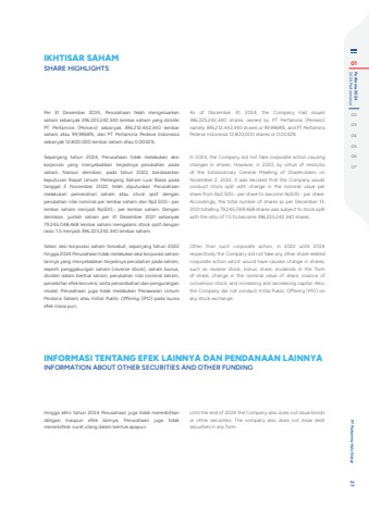 Per 31 Desember 2024, Perusahaan telah mengeluarkan saham sebanyak 396.225.242.340 lembar saham yang dimiliki PT Pertamina (Persero) sebanyak 396.212.442.340 lembar saham atau 99,9968%, dan PT Pertamina Pedeve Indonesia sebanyak 12.800.000 lembar saham atau 0,0032%.Sepanjang tahun 2024, Perusahaan tidak melakukan aksi korporasi yang menyebabkan terjadinya perubahan pada saham. Namun demikian, pada tahun 2022, berdasarkan keputusan Rapat Umum Pemegang Saham Luar Biasa pada tanggal 2 November 2022, telah diputuskan Perusahaan melakukan pemecahan saham atau stock split dengan perubahan nilai nominal per lembar saham dari Rp2.500,- per lembar saham menjadi Rp500,- per lembar saham. Dengan demikian, jumlah saham per 31 Desember 2021 sebanyak 79.245.048.468 lembar saham mengalami stock split dengan rasio 1:5 menjadi 396.225.242.340 lembar saham.Selain aksi korporasi saham tersebut, sepanjang tahun 2022 hingga 2024 Perusahaan tidak melakukan aksi korporasi saham lainnya yang menyebabkan terjadinya perubahan pada saham, seperti penggabungan saham (reverse stock), saham bonus, dividen dalam bentuk saham, perubahan nilai nominal saham, penerbitan efek konversi, serta penambahan dan pengurangan modal. Perusahaan juga tidak melakukan Penawaran Umum Perdana Saham atau Initial Public Offering (IPO) pada bursa efek mana pun.As of December 31, 2024, the Company had issued 396,225,242,340 shares owned by PT Pertamina (Persero) namely 396,212,442,340 shares or 99.9968%, and PT Pertamina Pedeve Indonesia 12,800,000 shares or 0.0032%.In 2024, the Company did not take corporate action causing changes in shares. However, in 2022, by virtue of resolutio of the Extraordinary General Meeting of Shareholders on November 2, 2022, it was decided that the Company would conduct stock split with change in the nominal value per share from Rp2,500.- per share to become Rp500.- per share. Accordingly, the total number of shares as per December 13, 2021 totalling 79,245,048,468 shares was subject to stock split with the ratio of 1:5 to become 396,225,242,340 shares.Other than such corporate action, in 2022 untill 2024 respectively the Company did not take any other share related corporate action which would have caused change in shares, such as reverse stock, bonus share, dividends in the form of share, change in the nominal value of share, issance of conversion stock, and increasing and decreasing capital. Also, the Company did not conduct Initial Public Offering (IPO) on any stock exchange.IKHTISAR SAHAMSHARE HIGHLIGHTSHingga akhir tahun 2024 Perusahaan juga tidak menerbitkan obligasi maupun efek lainnya. Perusahaan juga tidak menerbitkan surat utang dalam bentuk apapun.Until the end of 2024 the Company also does not issue bonds or other securities. The company also does not issue debt securities in any form.INFORMASI TENTANG EFEK LAINNYA DAN PENDANAAN LAINNYAINFORMATION ABOUT OTHER SECURITIES AND OTHER FUNDING01 2024 Performance Performa 2024020304050607Laporan Tahunan %u2022 Annual Report 26PT Pertamina Hulu Energi 27