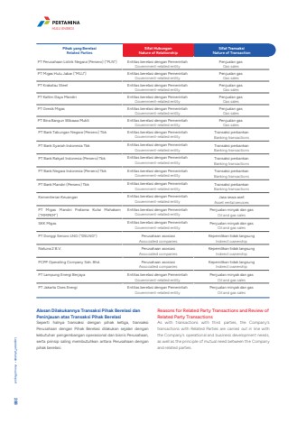 Pihak yang BerelasiRelated PartiesSifat HubunganNature of RelationshipSifat TransaksiNature of TransactionPT Perusahaan Listrik Negara (Persero) (%u201cPLN%u201d) Entitas berelasi dengan PemerintahGovernment-related entityPenjualan gasGas salesPT Migas Hulu Jabar (%u201cMUJ%u201d) Entitas berelasi dengan PemerintahGovernment-related entityPenjualan gasGas salesPT Krakatau Steel Entitas berelasi dengan PemerintahGovernment-related entityPenjualan gasGas salesPT Kaltim Daya Mandiri Entitas berelasi dengan PemerintahGovernment-related entityPenjualan gasGas salesPT Gresik Migas Entitas berelasi dengan PemerintahGovernment-related entityPenjualan gasGas salesPT Bina Bangun Wibawa Mukti Entitas berelasi dengan PemerintahGovernment-related entityPenjualan gasGas salesPT Bank Tabungan Negara (Persero) Tbk Entitas berelasi dengan PemerintahGovernment-related entityTransaksi perbankanBanking transactionsPT Bank Syariah Indonesia Tbk Entitas berelasi dengan PemerintahGovernment-related entityTransaksi perbankanBanking transactionsPT Bank Rakyat Indonesia (Persero) Tbk Entitas berelasi dengan PemerintahGovernment-related entityTransaksi perbankanBanking transactionsPT Bank Negara Indonesia (Persero) Tbk Entitas berelasi dengan PemerintahGovernment-related entityTransaksi perbankanBanking transactionsPT Bank Mandiri (Persero) Tbk Entitas berelasi dengan PemerintahGovernment-related entityTransaksi perbankanBanking transactionsKementerian Keuangan Entitas berelasi dengan PemerintahGovernment-related entityJasa sewa asetAsset rental servicesPT Migas Mandiri Pratama Kutai Mahakam (%u201cMMPKM%u201d)Entitas berelasi dengan PemerintahGovernment-related entityPenjualan minyak dan gasOil and gas salesSKK Migas Entitas berelasi dengan PemerintahGovernment-related entityPenjualan minyak dan gasOil and gas salesPT Donggi Senoro LNG (%u201cDSLNG%u201d) Perusahaan asosiasiAssociated companiesKepemilikan tidak langsungIndirect ownershipNatuna 2 B.V. Perusahaan asosiasiAssociated companiesKepemilikan tidak langsungIndirect ownershipPCPP Operating Company Sdn. Bhd. Perusahaan asosiasiAssociated companiesKepemilikan tidak langsungIndirect ownershipPT Lampung Energi Berjaya Entitas berelasi dengan PemerintahGovernment-related entityPenjualan minyak dan gasOil and gas salesPT Jakarta Oses Energi Entitas berelasi dengan PemerintahGovernment-related entityPenjualan minyak dan gasOil and gas salesAlasan Dilakukannya Transaksi Pihak Berelasi dan Peninjauan atas Transaksi Pihak BerelasiSeperti halnya transaksi dengan pihak ketiga, transaksi Perusahaan dengan Pihak Berelasi dilakukan sejalan dengan kebutuhan pengembangan operasional dan bisnis Perusahaan, serta prinsip saling membutuhkan antara Perusahaan dengan pihak berelasi.Reasons for Related Party Transactions and Review of Related Party TransactionsAs with transactions with third parties, the Company's transactions with Related Parties are carried out in line with the Company's operational and business development needs, as well as the principle of mutual need between the Company and related parties. Laporan Tahunan %u2022 Annual Report 288HULU ENERGI