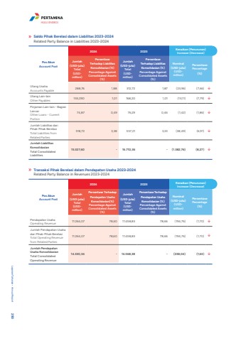 Saldo Pihak Berelasi dalam Liabilitas 2023-2024Related Party Balance in Liabilities 2023-2024Pos AkunAccount Post2024 2023 Kenaikan (Penurunan)Increase (Decrease)Jumlah(USD-juta)Total(USDmillion)Persentase Terhadap Liabilitas Konsolidasian (%)Percentage Against Consolidated Assets(%)Jumlah(USD-juta)Total(USDmillion)Persentase Terhadap Liabilitas Konsolidasian (%)Percentage Against Consolidated Assets(%)Nominal(USD-juta)(USDmillion)PersentasePercentage(%)Utang UsahaAccounts Payable 288,76 1,88 312,72 1,87 (23,96) (7,66) %uf0e2Utang Lain-lainOther Payables 155,090 1,01 168,20 1,01 (13,11) (7,79) %uf0e2Pinjaman Lain-lain - Bagian LancarOther Loans - Current Portion74,87 0,49 76,29 0,46 (1,42) (1,86) %uf0e2Jumlah Liabilitas dari Pihak-Pihak BerelasiTotal Liabilities from Related Parties518,72 3,38 557,21 3,33 (38,49) (6,91) %uf0e2Jumlah Liabilitas KonsolidasianTotal Consolidated Liabilities15.327,60 - 16.710,36 - (1.382,76) (8,27) %uf0e2Transaksi Pihak Berelasi dalam Pendapatan Usaha 2023-2024Related Party Balance in Revenues 2023-2024Pos AkunAccount Post2024 2023 Kenaikan (Penurunan)Increase (Decrease)Jumlah(USD-juta)Total(USDmillion)Persentase Terhadap Pendapatan Usaha Konsolidasian(%)Percentage Against Consolidated Assets(%)Jumlah(USD-juta)Total(USDmillion)Persentase Terhadap Pendapatan Usaha Konsolidasian (%)Percentage Against Consolidated Assets(%)Nominal(USD-juta)(USDmillion)PersentasePercentage(%)Pendapatan UsahaOperating Revenue 11.264,07 78,60 11.458,83 78,66 (194,76) (1,70) %uf0e2Jumlah Pendapatan Usaha dari Pihak-Pihak BerelasiTotal Operating Revenue from Related Parties11.264,07 78,60 11.458,83 78,66 (194,76) (1,70) %uf0e2Jumlah Pendapatan Usaha KonsolidasianTotal Consolidated Operating Revenue14.330,34 - 14.568,38 - (238,04) (1,63) %uf0e2Laporan Tahunan %u2022 Annual Report 290HULU ENERGI