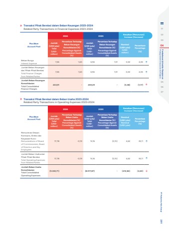 Transaksi Pihak Berelasi dalam Beban Keuangan 2023-2024Related Party Transactions in Financial Expenses 2023-2024Pos AkunAccount Post2024 2023 Kenaikan (Penurunan)Increase (Decrease)Jumlah(USD-juta)Total(USDmillion)Persentase Terhadap Beban Keuangan Konsolidasian (%)Percentage Against Consolidated Assets (%)Jumlah(USD-juta)Total(USDmillion)Persentase Terhadap Beban Keuangan Konsolidasian (%)Percentage Against Consolidated Assets(%)Nominal(USD-juta)(USDmillion)PersentasePercentage(%)Beban BungaInterest Expense 7,26 1,60 6,94 1,51 0,32 4,55 %uf0e1Jumlah Beban Keuangan dari Pihak-Pihak BerelasiTotal Finance Charges from Related Parties7,26 1,60 6,94 1,51 0,32 4,55 %uf0e1Jumlah Beban Keuangan KonsolidasianTotal Consolidated Finance Charges453,91 - 459,29 - (5,38) (1,17) %uf0e2Transaksi Pihak Berelasi dalam Beban Usaha 2023-2024Related Party Transactions in Operating Expenses 2023-2024Pos AkunAccount Post2024 2023 Kenaikan (Penurunan)Increase (Decrease)Jumlah(USD-juta)Total(USDmillion)Persentase Terhadap Beban Usaha Konsolidasian (%)Percentage Against Consolidated Assets(%)Jumlah(USD-juta)Total(USDmillion)Persentase Terhadap Beban Usaha Konsolidasian (%)Percentage Against Consolidated Assets(%)Nominal(USD-juta)Nominal(USD-juta)PersentasePercentage(%)Remunerasi Dewan Komisaris, Direksi dan Karyawan KunciRemunerations of Board of Commissioners, Board of Directors and Key Employees17,78 -0,19 13,16 (0,15) 4,62 35,11 %uf0e1Jumlah Beban Usaha dari Pihak-Pihak BerelasiTotal Operating Expenses from Related Parties17,78 -0,19 13,16 (0,15) 4,62 35,11 %uf0e1Jumlah Beban Usaha KonsolidasianTotal Consolidated Operating Expenses(9.330,71) - (8.917,87) - (412,84) (4,63) %uf0e2010203 04 Management Discussion & Analysis Pembahasan & Analisis Manajemen050607 PT Pertamina Hulu Energi 291