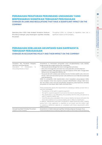 Sepanjang tahun 2024, tidak terdapat Perubahan Peraturan Perundang-Undangan yang berpengaruh signifikan terhadap Perusahaan.Throughout 2024, no changes to legislation have had a significant impact on the Company.PERUBAHAN PERATURAN PERUNDANG-UNDANGAN YANG BERPENGARUH SIGNIFIKAN TERHADAP PERUSAHAANCHANGES IN LAWS AND REGULATIONS THAT HAVE A SIGNIFICANT IMPACT ON THE COMPANYPERUBAHAN KEBIJAKAN AKUNTANSI DAN DAMPAKNYA TERHADAP PERUSAHAANCHANGES IN ACCOUNTING POLICY AND THEIR IMPACT ON THE COMPANYPenjelasan atas Perubahan Kebijakan Akuntansi yang Diberlakukan Description of Amendments to Accounting Policies in Force: Amandemen ini menentukan persyaratan untuk mengklasifikasikan suatu liabilitas jangka pendek atau jangka panjang dan menjelaskan:%u2022 Hal yang dimaksud sebagai hak untuk menangguhkan pelunasan,%u2022 Hak untuk menangguhkan pelunasan harus ada pada akhir periode pelaporan%u2022 Klasifikasi tersebut tidak dipengaruhi oleh kemungkinan entitas akan menggunakan haknya untuk menangguhkan liabilitas, dan%u2022 Hanya jika derivatif melekat pada liabilitas konversi tersebut adalah suatu instrumen ekuitas, maka syarat dan ketentuan dari suatu liabilitas konversi tidak akan berdampak pada klasifikasinya.Selain itu, persyaratan telah diperkenalkan untuk mewajibkan pengungkapan ketika suatu kewajiban timbul dari pinjaman perjanjian diklasifikasikan sebagai tidak lancar dan hak entitas untuk menunda penyelesaian bergantung pada kepatuhan terhadap persyaratan di masa depan dalam waktu dua belas bulan.These amendments specify the requirements for classifying a liability as short-term or long-term and explain:%u2022 The definition of the right to suspend a payment,%u2022 The right to suspend a payment must exist at the end of a reporting period.%u2022 The classification is not affected by the possibility that the entity will exercise its right to suspend a liability, and%u2022 Only if the derivative embedded in the conversion liability is an equity instrument, the terms and conditions of a conversion liability will not affect its classification.In addition, requirements have been introduced to require disclosure when a liability arising from a loan agreement is classified as non-current and the entity's right to suspend a settlement depends on compliance with future requirements within twelve months.Dampak Kuantitatif Terhadap PerusahaanImpacts on the Company: Amandemen ini tidak berdampak signifikan terhadap pelaporan keuangan Grup.These amendments do not have any significant impact on the Group's financial reporting.010203 04 Management Discussion & Analysis Pembahasan & Analisis Manajemen050607 PT Pertamina Hulu Energi 293