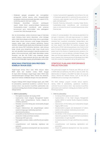 %u2022 Melakukan agregasi pengadaan dan meningkatkan penggunaan kontrak payung untuk mengoptimalkan pengadaan material yang banyak digunakan, seperti OCTG, cementing, pipa lini, dan suku cadang.%u2022 Melakukan diversifikasi instrumen pembiayaan seperti Global Bond, pinjaman/obligasi berkelanjutan (Sustainability-Linked Loan/Bond), serta pinjaman konvensional guna meminimalkan risiko pelanggaran covenant dan risiko keuangan lainnya.Dari sisi komersialisasi, potensi komersial migas di Indonesia masih terbilang besar karena dibutuhkan untuk berbagai sektor, tidak hanya sebagai sumber energi, namun juga sebagai bahan bakar industri, konsumsi rumah tangga, transportasi, maupun bahan baku untuk produksi petrokimia, Namun demikian, terdapat banyak aspek yang mempengaruhi prospek usaha dan kinerja PHE Subholding Upstream, salah satunya harga minyak yang bergantung pada harga minyak dunia dan sulit diprediksi karena pengaruh dinamika perekonomian global, Untuk komersial gas, relatif dapat dikendalikan melalui Perjanjian Jual Beli Gas (PJBG) yang disepakati dengan pembeli, Namun, harga komersial gas bumi dari PJBG tetap harus memertimbangkan regulasi yang ditetapkan pemerintah.RENCANA STRATEGIS DAN PROYEKSI KINERJA TAHUN 2025Target-target kinerja tahun buku 2025 disusun dalam RKAP 2025 dan disahkan melalui RUPS tanggal 25 April 2025 Penetapan target-target dalam RKAP telah mempertimbangkan berbagai faktor internal dan eksternal, seperti ICP sebesar USD82/bbl dengan nilai tukar Rp16.000.Program strategis 2025 meliputi berbagai aspek, yaitu HSSE & sustainability, operational excellence, customer focus & revenue driver, new business & portfolio optimization dan investment strategy & prioritization dengan program-program sebagai berikut:1. HSSE & sustainability:%u2022 Peningkatan kesadaran dan budaya HSSE.%u2022 Implementasi Asset Integrity Management System (AIMS) untuk mempertahanan facility integrity & realibility operation.%u2022 Perbaikan score ESG Rating dan Sustainability Budget Tagging (SBT). %u2022 Program Dekarbonisasi dan pengembangan carbon market di lingkungan Subholding Upstream.%u2022 Operational Excellence:%u2022 Percepatan proses transformasi resource ke reserves to production melalui prioritisasi investasi.%u2022 Pelaksanaan KKP open area.%u2022 Peningkatan produksi melalui waterflood & percepatan EOR.%u2022 competitiveness: cost leadership, digitalisasi dan automasi.%u2022 People & operational development dan new business capabilities.%u2022 Conduct procurement aggregation and enhance the use of framework agreements to optimize the procurement of commonly used materials, such as OCTG, cementing, line pipes, and spare parts.%u2022 Diversify financing instruments, including Global Bonds, Sustainability-Linked Loans/Bonds, and conventional loans, to minimize the risk of covenant breaches and other financial risks.In terms of commercialization, the commercial potential of oil and gas in Indonesia is still quite large because it is needed for various sectors, not only as an energy source, but also as industrial fuel, household consumption, transportation, and raw materials for petrochemical production. However, there are many aspects that affect the business prospects and performance of PHE Subholding Upstream, one of which is the price of oil which depends on world oil prices and is difficult to predict due to the influence of global economic dynamics. For commercial gas, it can be relatively controlled through a Gas Sales and Purchase Agreement (PJBG) agreed upon with the buyer. However, the commercial price of natural gas from PJBG must still consider the regulations set by the government.STRATEGIC PLAN AND PERFORMANCE PROJECTION 2025The performance targets for financial year 2025 are set out in RKAP 2025 and ratified by the GMS on April 25, 2025. The determination of targets in the RKAP has taken into account various internal and external factors, such as the ICP of USD82/bbl with an exchange rate of Rp16,000.The 2025 strategic program includes various aspects, namely HSSE & sustainability, operational excellence, customer focus & revenue driver, new business & portfolio optimization and investment strategy & prioritization with the following programs:1. HSSE & sustainability:%u2022 Increasing HSSE awareness and culture.%u2022 Implementation of the Asset Integrity Management System (AIMS) to maintain facility integrity & reliability operations.%u2022 Improvement of ESG Rating and Sustainability Budget Tagging (SBT) scores.%u2022 Decarbonization program and development of carbon markets in the Upstream Subholding environment.%u2022 Operational Excellence:%u2022 Acceleration of the resource transformation process to reserves to production through investment prioritization%u2022 Implementation of open area KKP.%u2022 Increased production through waterflood & accelerated EOR.%u2022 competitiveness: cost leadership, digitalization and automation.%u2022 People & operational development and new business capabilities.010203 04 Management Discussion & Analysis Pembahasan & Analisis Manajemen050607 PT Pertamina Hulu Energi 295