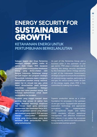 ENERGY SECURITY FORSUSTAINABLE GROWTHKETAHANAN ENERGI UNTUK PERTUMBUHAN BERKELANJUTANSebagai bagian dari Grup Pertamina sekaligus sebagai pelaku usaha di sektor hulu migas, PHE berperan strategis dalam mewujudkan ketahanan energi yang dicita-citakan oleh Bangsa Indonesia. Ketahanan energi menjadi bagian dari program strategis Pemerintah Indonesia dalam menjamin ketersediaan pasokan energi nasional, dalam hal ini minyak dan gas, untuk dapat dimanfaatkan pada berbagai kebutuhan masyarakat. Sebagai bagian dari rantai pasokan energi, PHE tentunya berkomitmen untuk dapat mewujudkan hal tersebut.Produksi yang unggul menjadi dasar penting bagi proses di sektor hulu migas. Berbekal teknologi eksplorasi dan inovasi tepat guna, penerapan Keselamatan dan Kesehatan Kerja (K3), serta pengelolaan operasi yang efisien dan investasi yang efektif, PHE percaya mampu mewujudkan ketahanan energi yang dicita-citakan yang akan berimbas pada pertumbuhan bisnis yang berkelanjutan.As part of the Pertamina Group and a business actor in the upstream oil and gas sector, PHE plays a strategic role in realizing the energy security envisioned by the Indonesian nation. Energy security is part of the Indonesian Government%u2019s strategic program to ensure the availability of national energy supplies, particularly oil and gas, for various public needs. As part of the energy supply chain, PHE is fully committed to making this a reality.Superior production serves as a critical foundation for processes in the upstream oil and gas sector. Equipped with advanced exploration technology and appropriate innovations, the implementation of Occupational Health and Safety (OHS) standards, efficient operational management, and effective investment, PHE believes it can realize the envisioned energy security, which in turn will contribute to sustainable business growth.01020304050607Laporan Tahunan %u2022 Annual Report iiPT Pertamina Hulu Energi 1 01020304050607 PT Pertamina Hulu Energi 1