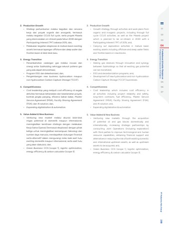 2. Production Growth%u2022 Strategi pertumbuhan melalui kegiatan dan rencana kerja dari proyek organik dan anorganik, termasuk melalui kegiatan CCUS full cycle, serta proyek Masela yang direncanakan on-stream pada tahun 2030 dengan Participating Interest (%u201cPI%u201d) sebesar 20%; dan,%u2022 Melakukan kegiatan eksplorasi di mature basin existing assets termasuk lapangan offshore dan deep water dan frontier basin di blok-blok baru.3. Energy Transition%u2022 Penambahahan cadangan gas melalui inovasi dan sinergi antar Subholding sehingga seluruh potensi gas yang ada dapat dimonetisasi;%u2022 Program ESG dan dekarbonisasi; dan,%u2022 Pengembangan new business hydrocarbon maupun non-hydrocarbon Carbon Capture Storage (%u201cCCS%u201d).4. Competitiveness%u2022 Cost leadership yang meliputi cost efficiency di segala aktivitas termasuk kehandalan dan keselamatan proyek, kontrak jangka panjang, efisiensi bahan bakar, Master Service Agreement (MSA), Facility Sharing Agreement(FSA), dan AI solution; dan,%u2022 Expanding digitalization & automation.5. Value Added & New Business%u2022 Venturing new market melalui akuisisi blok-blok migas potensial di domestik maupun internasional, meningkatkan kemitraan strategis dengan melakukan Kerja Sama Operasi (termasuk eksplorasi) dengan pihak ketiga untuk meningkatkan kemampuan teknologi dan sumber daya manusia, mendapatkan dukungan finansial serta alternatif dalam mengurangi risiko baik aset hulu existing domestik maupun internasional, serta aset hulu yang akan diakuisisi; dan,%u2022 Green Business: CCS (scope 1), logistic optimization, energy efficiency & carbon calculator (scope 3).2. Production Growth%u2022 Growth strategy through activities and work plans from organic and inorganic projects, including through full cycle CCUS activities, as well as the Masela project which is planned to be on-stream in 2030 with a Participating Interest (%u201cPI%u201d) of 20%; and,%u2022 Carrying out exploration activities in mature basin existing assets including offshore and deep water fields and frontier basins in new blocks.3. Energy Transition%u2022 Adding gas reserves through innovation and synergy between Subholdings so that all existing gas potential can be monetized;%u2022 ESG and decarbonization programs; and,%u2022 Development of new hydrocarbon and non-hydrocarbon Carbon Capture Storage (%u201cCCS%u201d) businesses.4. Competitiveness%u2022 Cost leadership which includes cost efficiency in all activities including project reliability and safety, long-term contracts, fuel efficiency, Master Service Agreement (MSA), Facility Sharing Agreement (FSA), and AI solution; and,%u2022 Expanding digitalization & automation.5. Value Added & New Business%u2022 Venturing new markets through the acquisition of potential oil and gas blocks domestically and internationally, increasing strategic partnerships by conducting Joint Operations (including exploration) with third parties to improve technological and human resource capabilities, obtaining financial support and alternatives in reducing the risk of both existing domestic and international upstream assets, as well as upstream assets to be acquired; and,%u2022 Green Business: CCS (scope 1), logistic optimization, energy efficiency & carbon calculator (scope 3).010203 04 Management Discussion & Analysis Pembahasan & Analisis Manajemen050607 PT Pertamina Hulu Energi 299