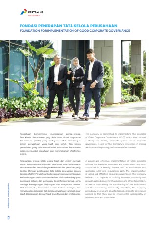 Perusahaan berkomitmen menerapkan prinsip-prinsip Tata Kelola Perusahaan yang Baik atau Good Corporate Governance (GCG) yang bertujuan untuk membangun sistem perusahaan yang kuat dan sehat. Tata kelola perusahaan yang baik menjadi salah satu acuan Perusahaan dalam mengambil keputusan dan meningkatkan efektivitas kinerja.Pelaksanaan prinsip GCG secara tepat dan efektif menjadi cermin bahwa proses bisnis dan tata kelola telah berlangsung secara sehat dan sesuai dengan ketentuan dan peraturan yang berlaku. Dengan pelaksanaan tata kelola perusahaan secara baik dan efektif, Perusahaan berkeyakinan mampu membangun kesinambungan usaha dan memberikan nilai tambah bagi para pemegang saham dan pemangku kepentingan lainnya, serta menjaga kelangsungan lingkungan dan masyarakat sekitar. Oleh karena itu, Perusahaan secara berkala meninjau dan menyesuaikan kebijakan tata kelola perusahaan yang baik agar dapat dilaksanakan dengan tepat di unit bisnis dan entitas anak.FONDASI PENERAPAN TATA KELOLA PERUSAHAANFOUNDATION FOR IMPLEMENTATION OF GOOD CORPORATE GOVERNANCEThe company is committed to implementing the principles of Good Corporate Governance (GCG) which aims to build a strong and healthy corporate system. Good corporate governance is one of the Company's references in making decisions and improving performance effectiveness.A proper and effective implementation of GCG principles reflects that business processes and governance have been conducted in a healthy manner and in accordance with applicable rules and regulations. With the implementation of good and effective corporate governance, the Company believes it is capable of building business continuity and providing added values for shareholders and other stakeholders, as well as maintaining the sustainability of the environment and the surrounding community. Therefore, the Company periodically reviews and adjusts its good corporate governance policies so that they can be implemented appropriately in business units and subsidiaries.Laporan Tahunan %u2022 Annual Report 302HULU ENERGI